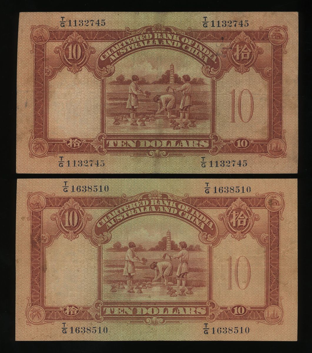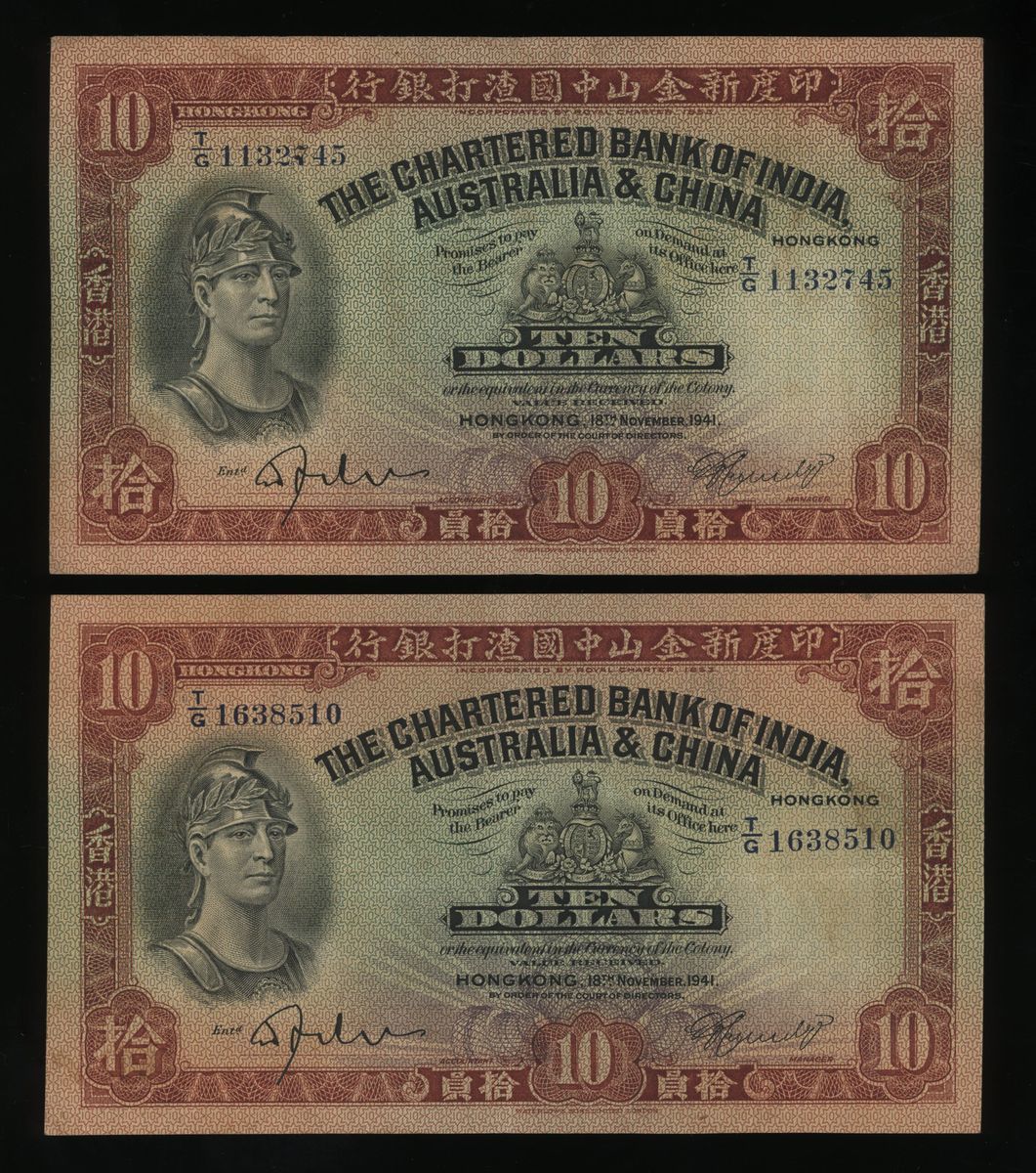Chartered Bank of India, Australia & China, Hong Kong, a pair of $10, 1941, serial number T/G1132745 and T/G1638510, (Pick 55c), with stains, very fine or better.(2)