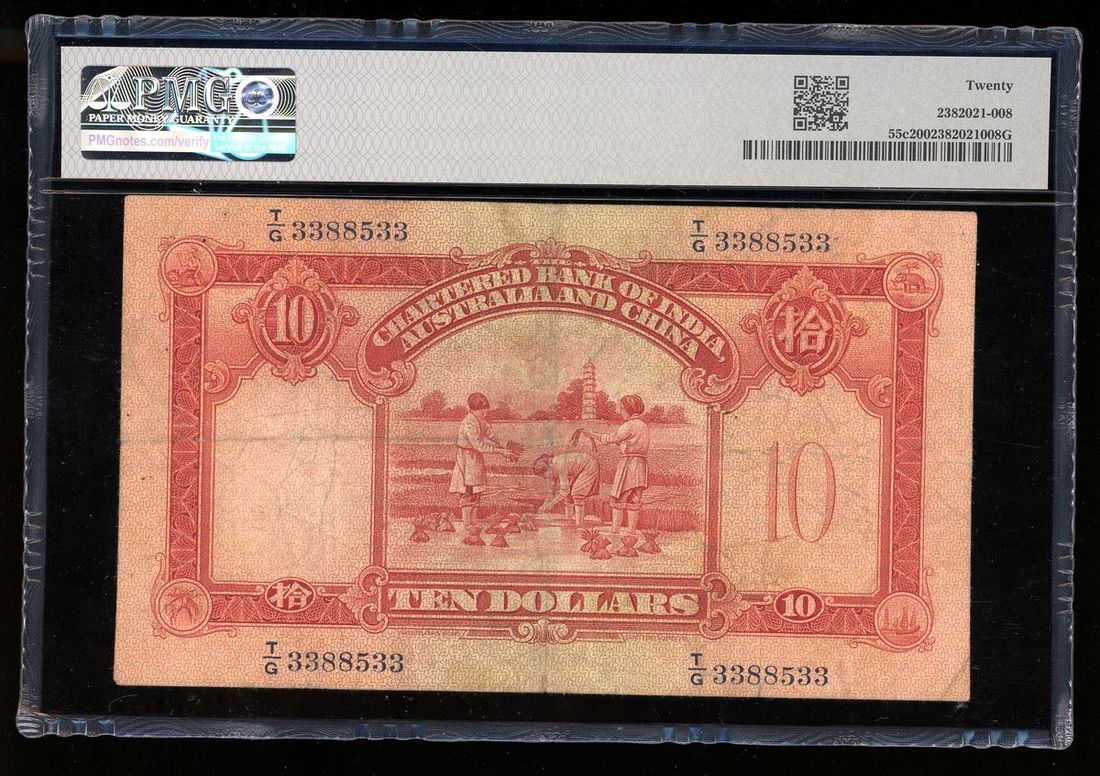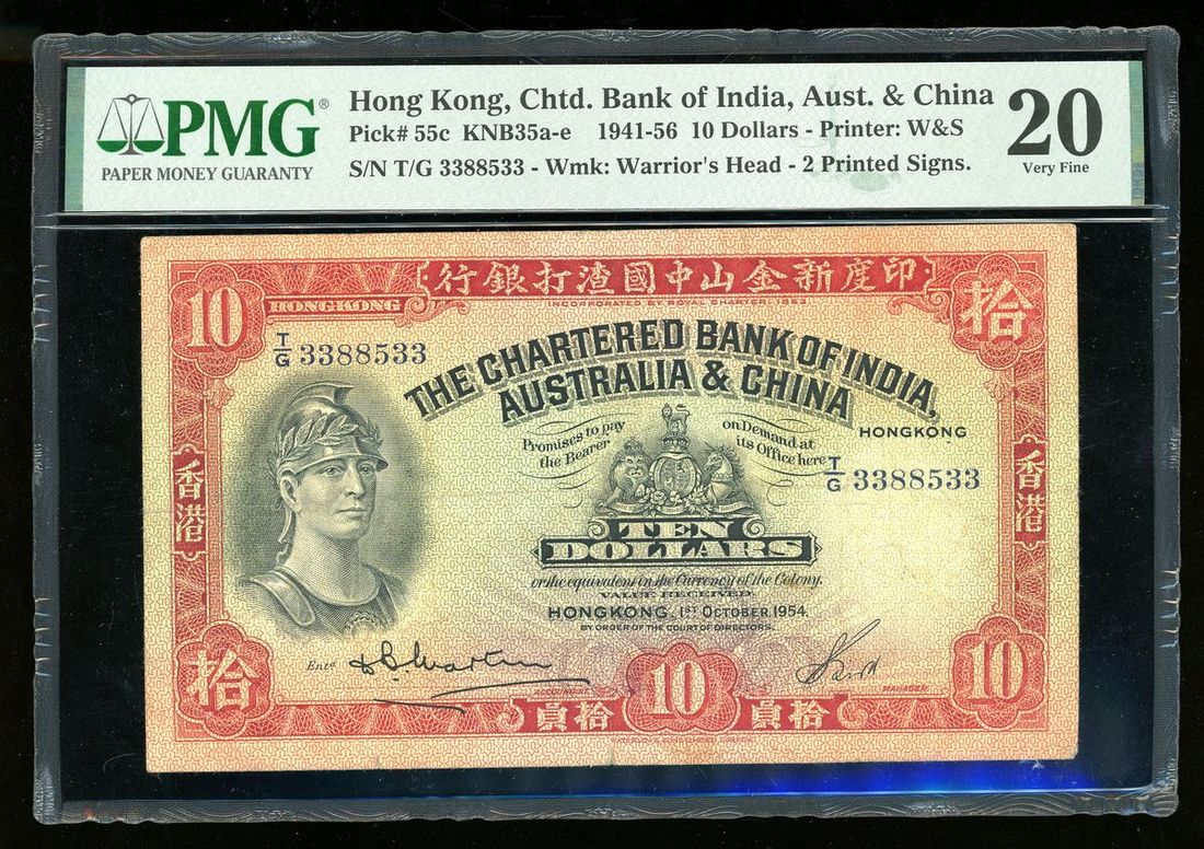 Chartered Bank of India, Australia & China, Hong Kong, $10, 1.10.1954, serial number T/G 3388533, (Pick 55c), PMG 20 Very Fine