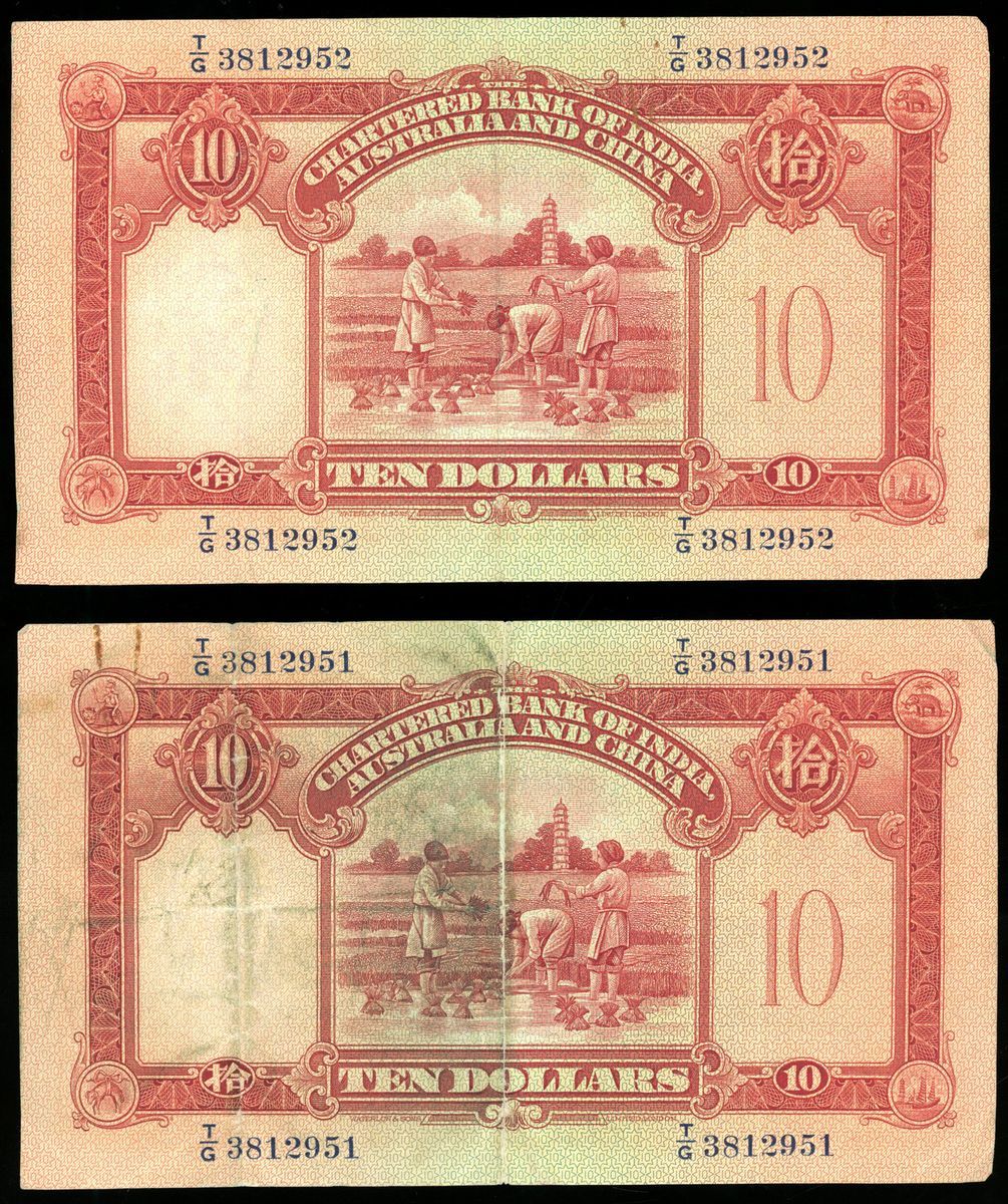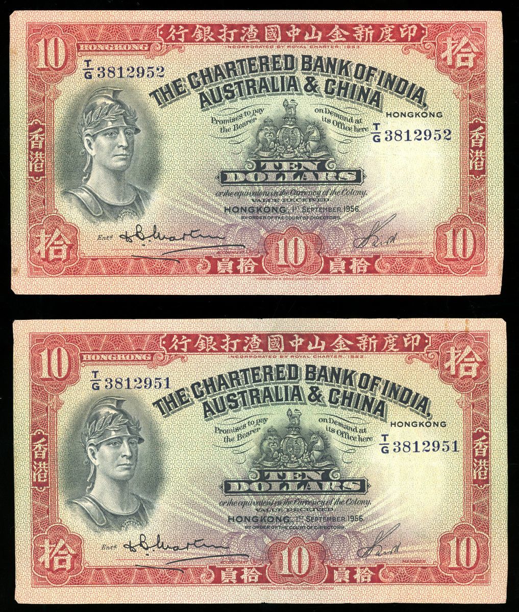Chartered Bank of India, Australia & China, Hong Kong, consecutive pair $10 (2), 1.9.1956, serial numbers T/G 3812951/52, (Pick 55c), original very fine (2)