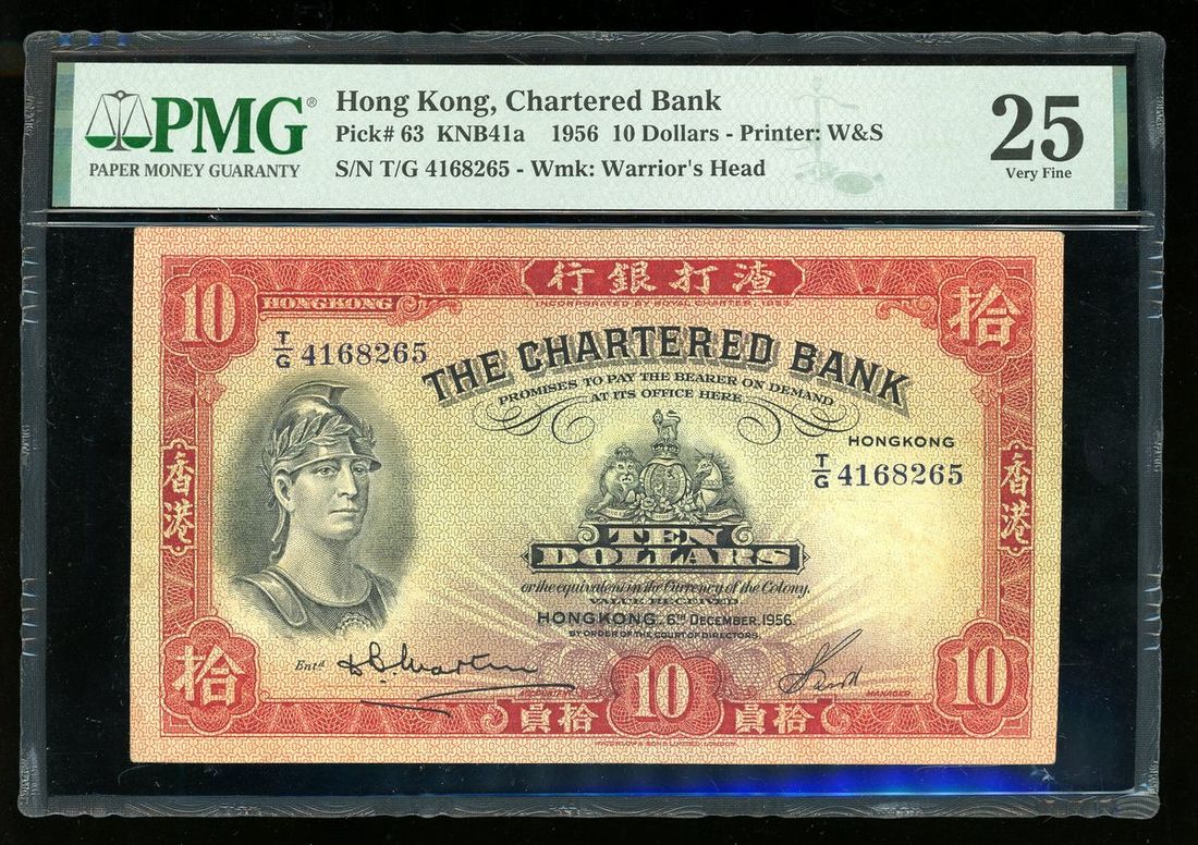 Chartered Bank, Hong Kong, $10, 6.12.1956, serial number T/G 4168265, (Pick 63), PMG 25 Very Fine
