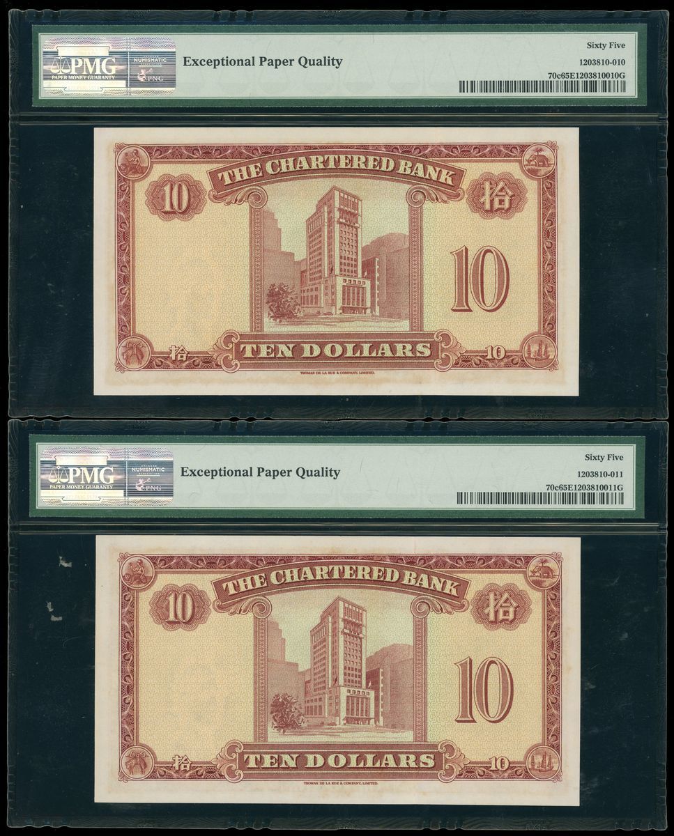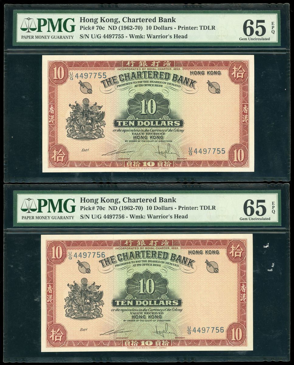Chartered Bank, Hong Kong, consecutive pair $10, ND (1962-70), serial numbers U/G 4497755/56, (Pick 70c), PMG 65EPQ gem uncirculated (2)