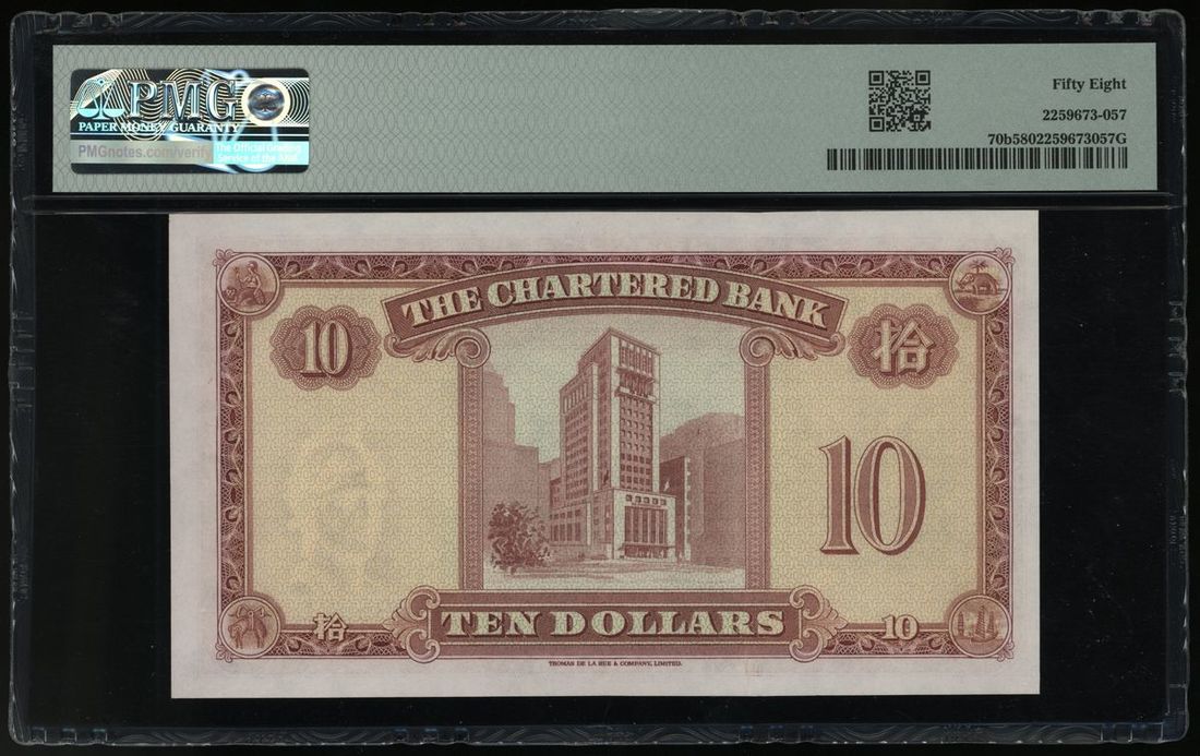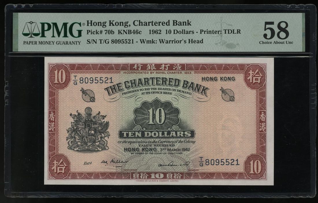 Chartered Bank, Hong Kong, $10, 3.3.1962, serial number T/G 8095521, (Pick 70b), PMG 58