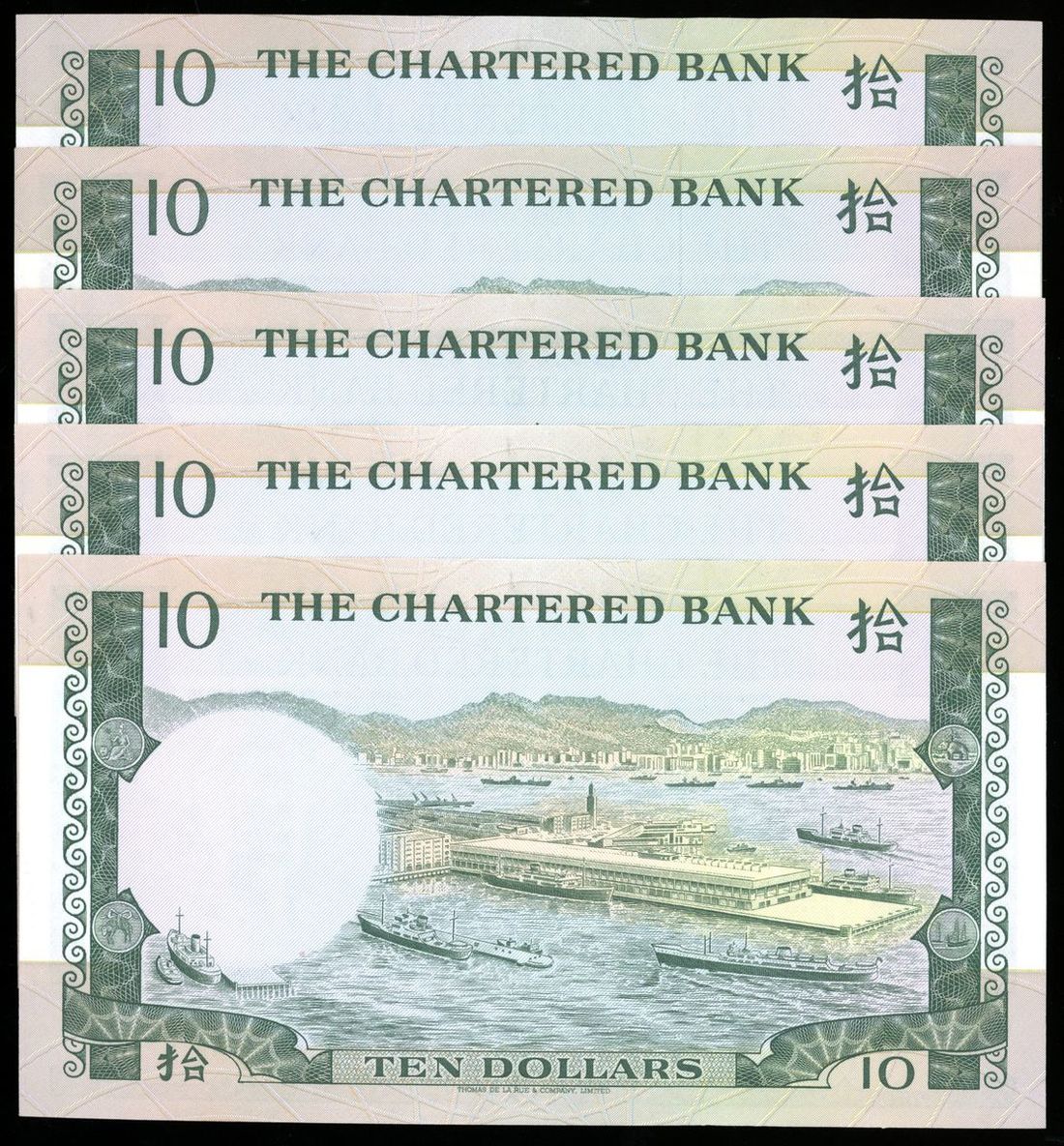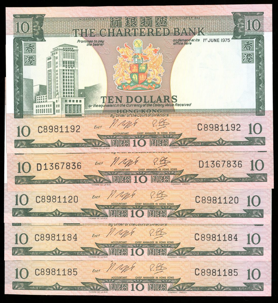Chartered Bank, Hong Kong, $10 (5), 1.6.1975, prefixes C, D, (Pick 74b), balance about uncirculated to uncirculated. 1975 dated issue less often seen (5)