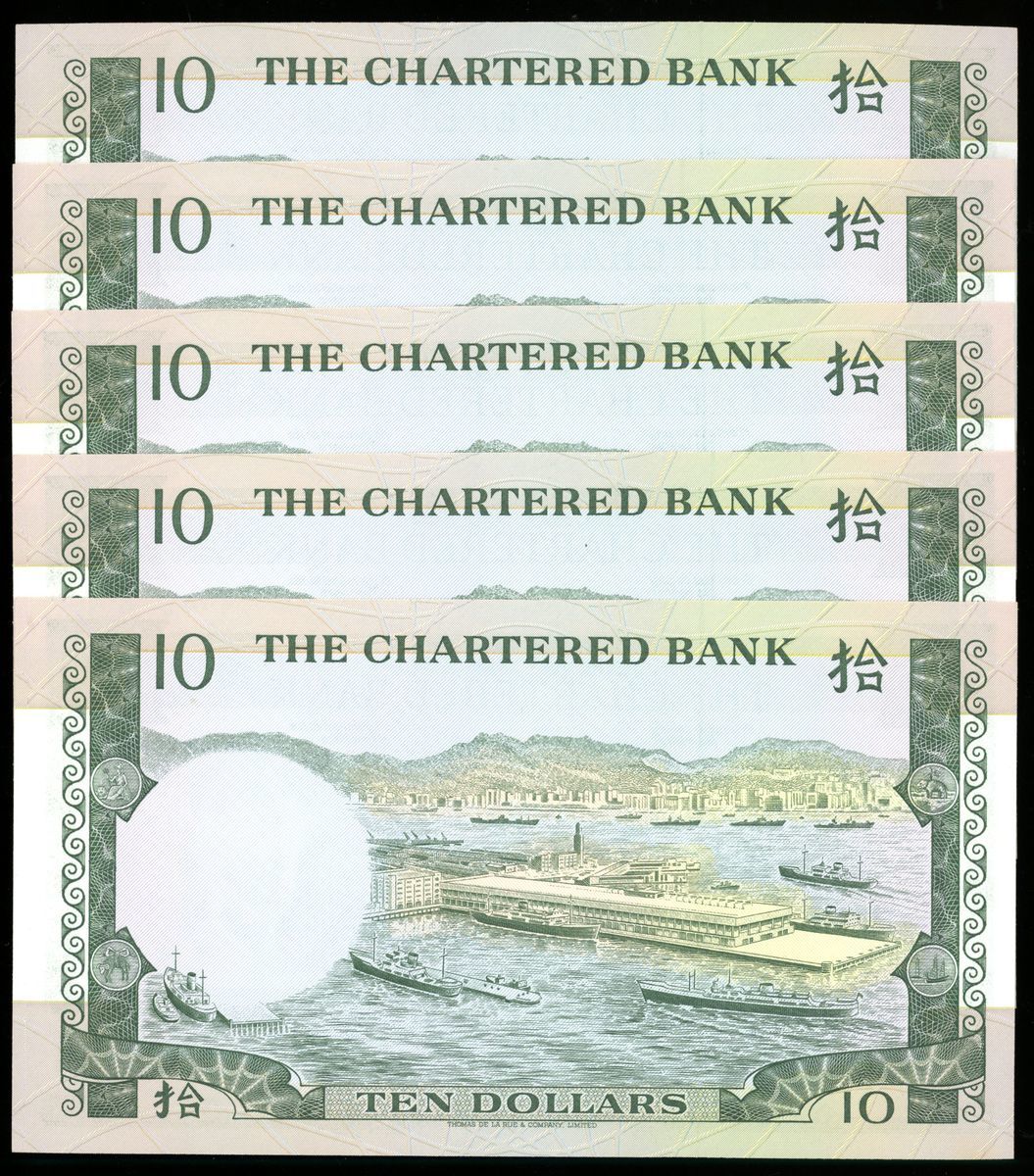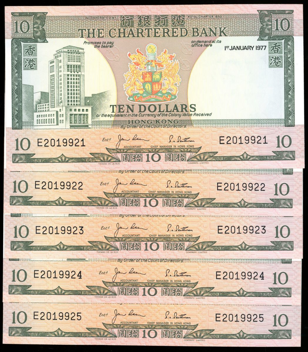 Chartered Bank, Hong Kong, consecutive $10 (5), 1.1.1977, serial numbers E2019921/2/3/4/5, (Pick 74c), uncirculated (5)