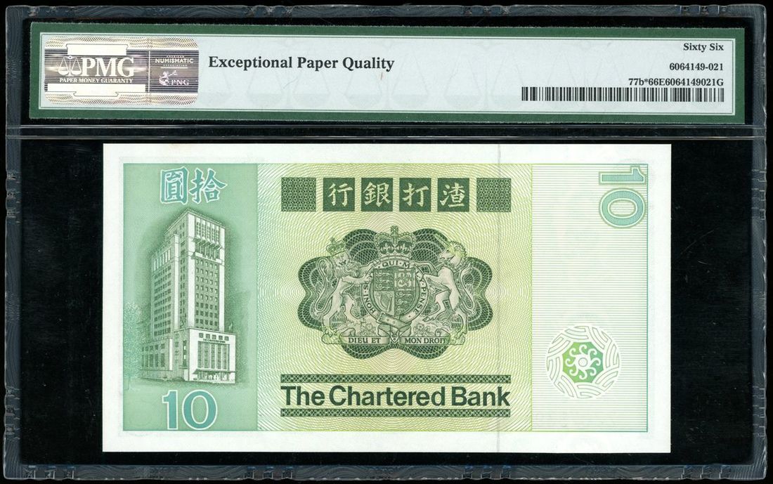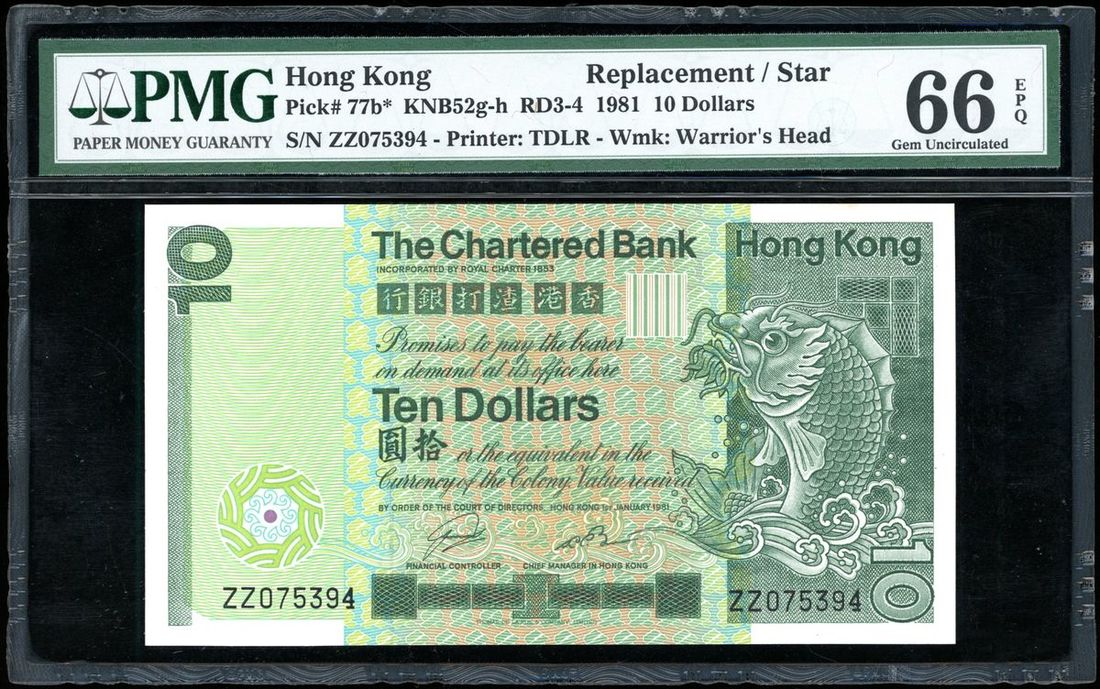 Chartered Bank, Hong Kong, replacement $10, 1.1.1981, serial number ZZ075394, (Pick 77b*), PMG 66EPQ. Minor foxing at top margin not mentioned by PMG.