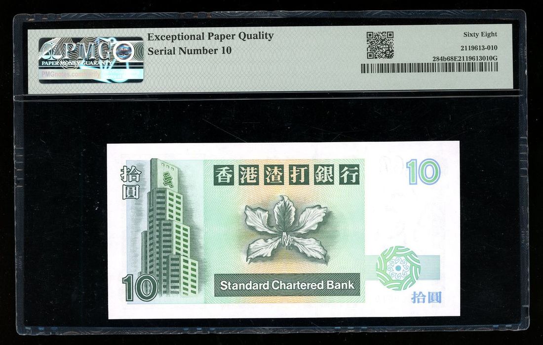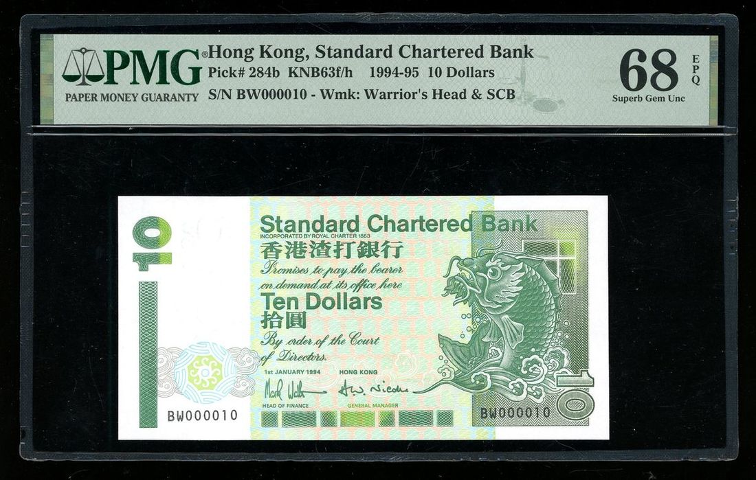 Standard Chartered Bank, Hong Kong, $10, 1.1.1994, low serial number BW 000010, (Pick 284b), PMG 68EPQ Superb Gem Uncirculated