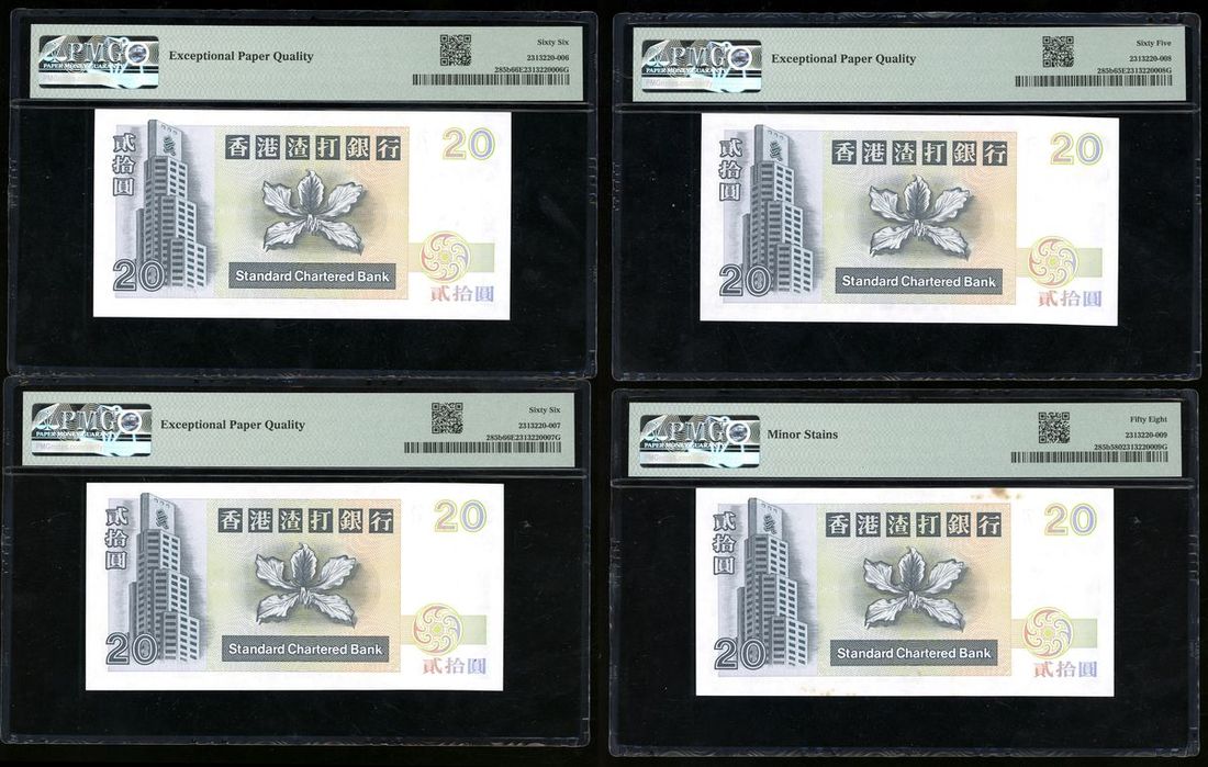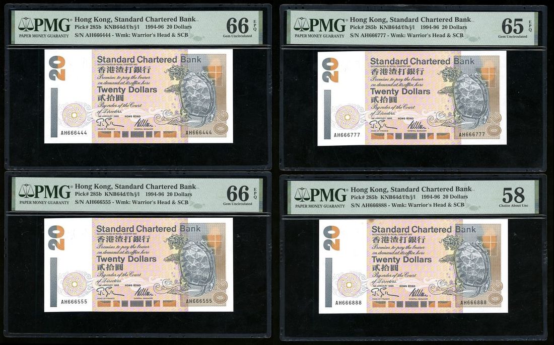 Standard Chartered Bank, Hong Kong, a group of 4x $20, 1.1.1995, fancy serial numbers AH 666444, AH 666555, AH 666777, AH 666888,
