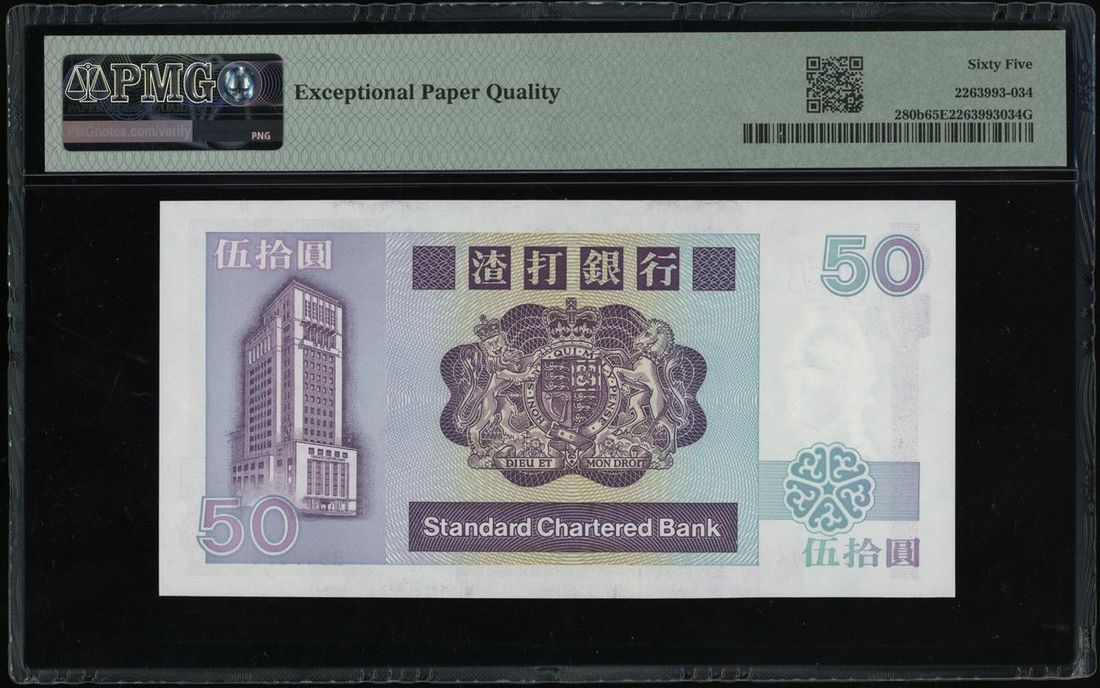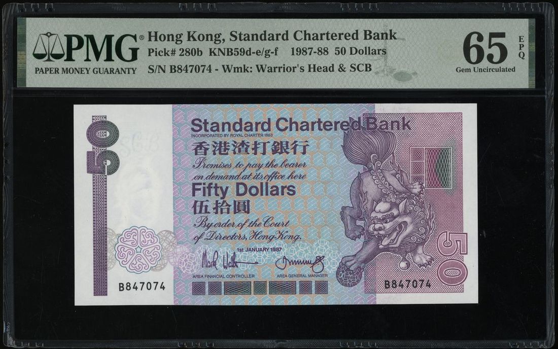 Standard Chartered Bank, Hong Kong, $50, 1.1.1987, serial number B847074, (Pick 280b), PMG 65EPQ. Crossover over prefix with 1985 issue