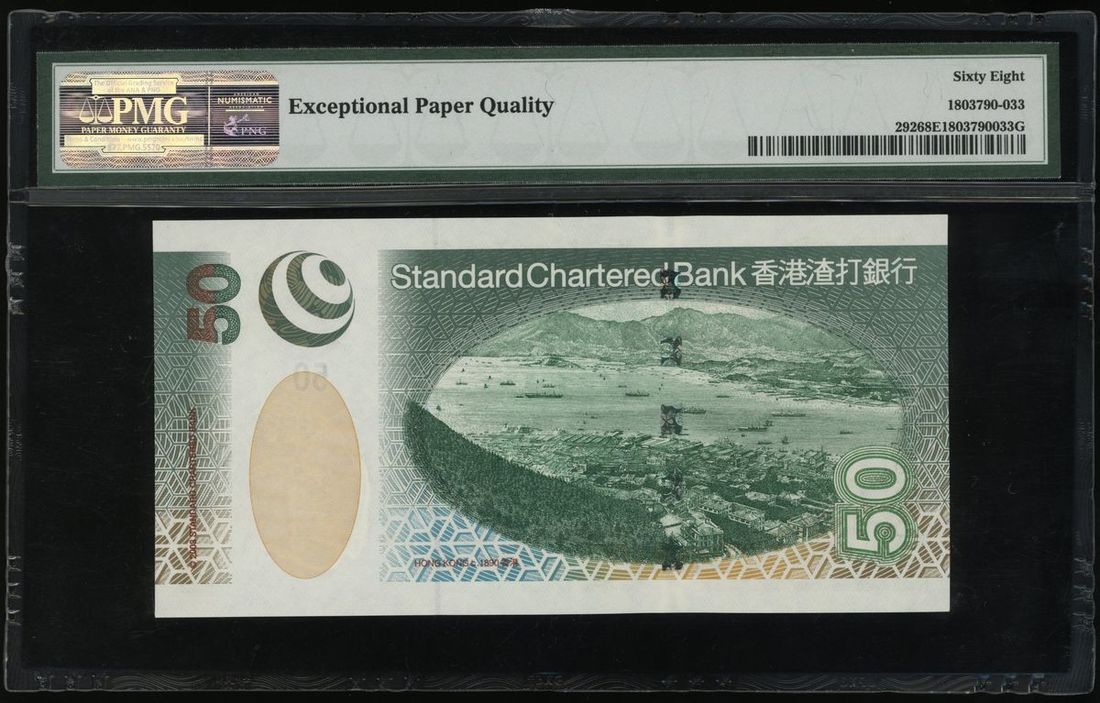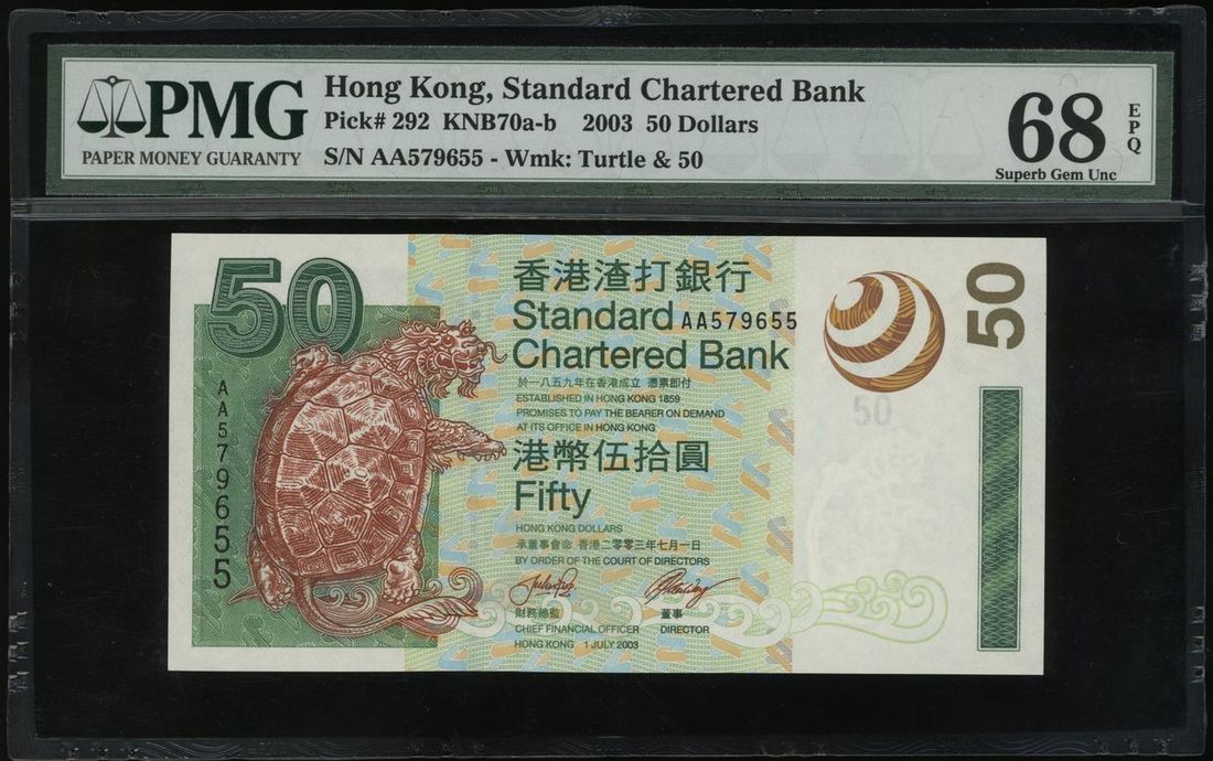 Standard Chartered Bank, Hong Kong, $50, 1.7.2003, serial number AA 579655, (Pick 292), PMG 68EPQ Superb Gem Uncirculated, first prefix