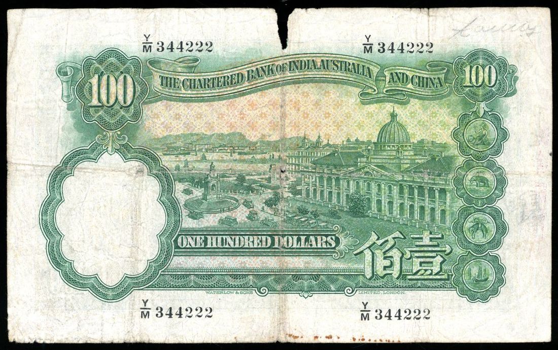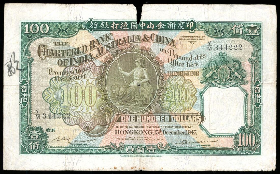 Chartered Bank of India, Australia & China, Hong Kong, $100, 15.12.1947, serial number Y/M 344222, (Pick 57c), tear at top margin, ink annotation at left, pencil annotation at reverse, about fine
