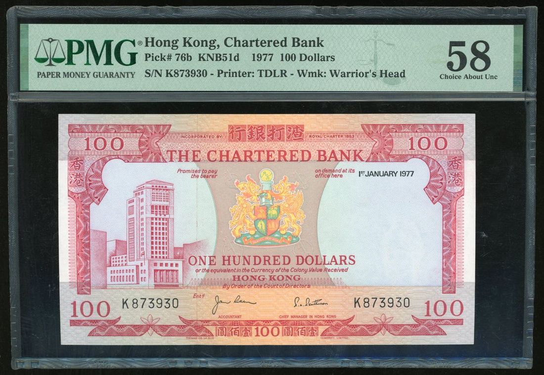 Chartered Bank, Hong Kong, $100, 1.1.1977, serial number K 873930, (Pick 76b), PMG 58
