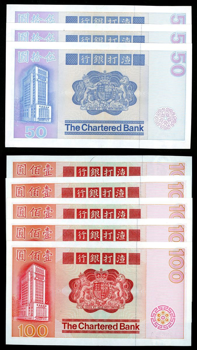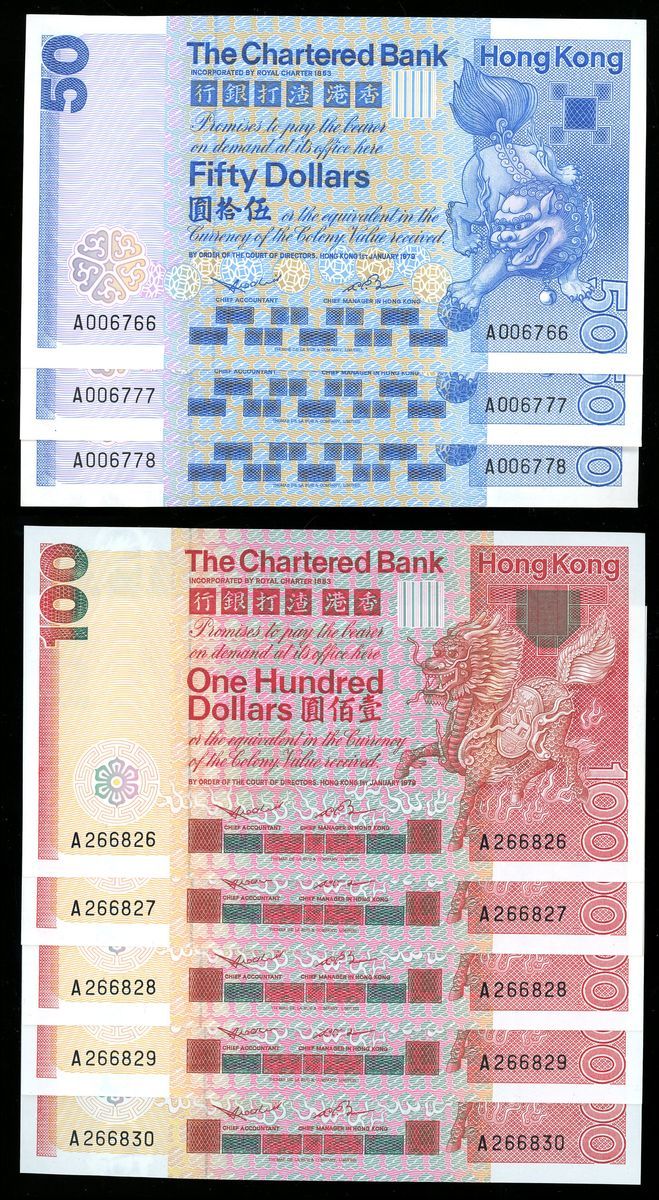 Chartered Bank, Hong Kong, a group of 8x, 1.1.1979, all A prefix, includes, $50 (3), serial numbers A006766/777/778, and consecutive $100 (5), serial numbers A266826/7/8/9/30,