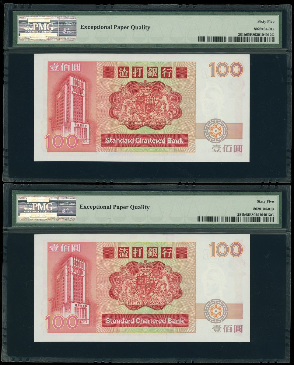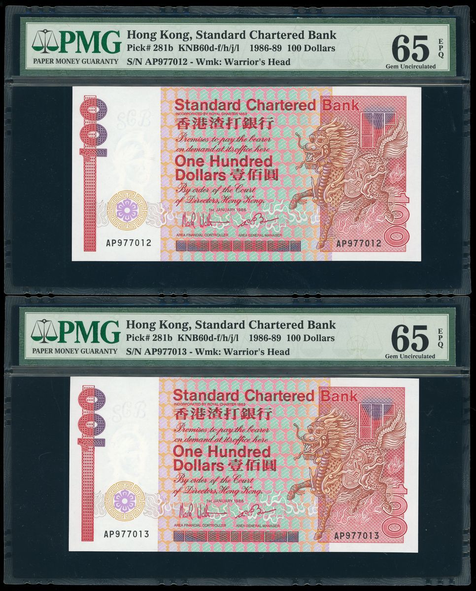 Standard Chartered Bank, Hong Kong, consecutive pair $100, 1.1.1986, serial number AP977012/013, (Pick 281b), both PMG 65EPQ gem uncirculated (2)