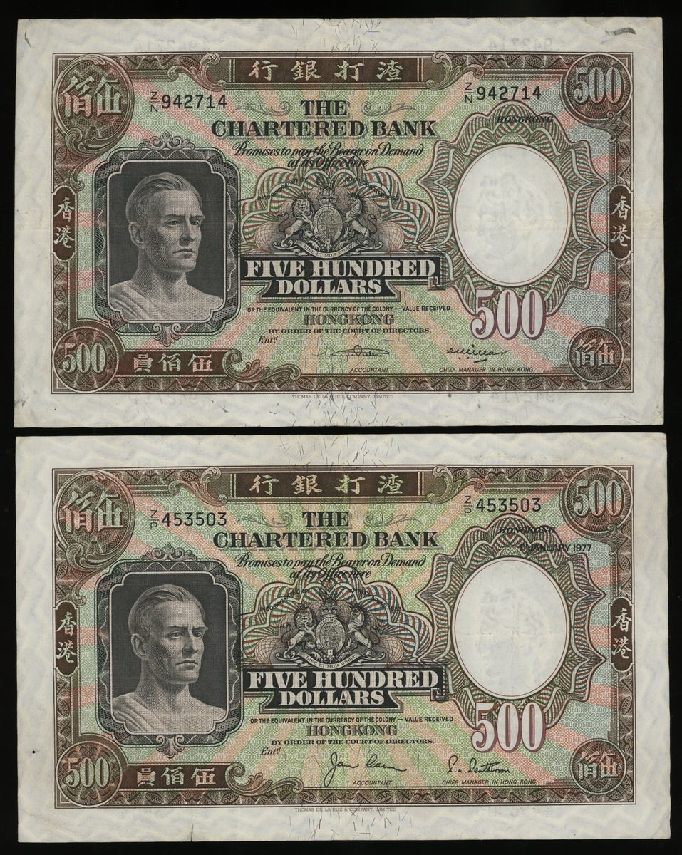 1977年渣打銀行伍佰元一組2枚,有針孔及下部邊緣有微裂