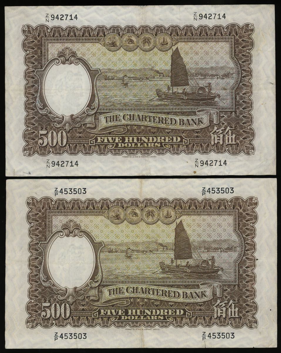 Chartered Bank, Hong Kong, $500 (2), ND (1962-75), 1977, (Pick 72c, d), very fine, 1977 issue with pinhole at left margin and minor split at lower margin (2)