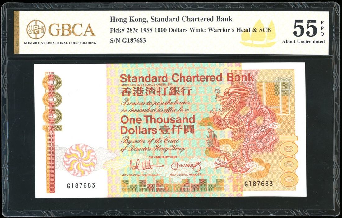 Standard Chartered Bank, Hong Kong, $1000, 1.1.1988, serial number G187683, (Pick 283c), GBCA 55EPQ
