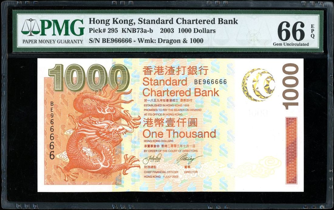 Standard Chartered Bank, Hong Kong, $1000, 1.7.2003, near solid serial number BE966666, (Pick 295), PMG 66EPQ