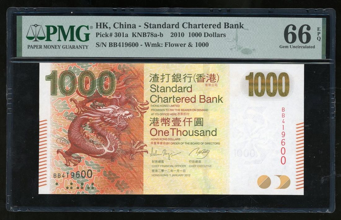 Standard Chartered Bank, Hong Kong, $1000, 1.1.2012, serial number BB 419600, (Pick 301a), PMG 66EPQ