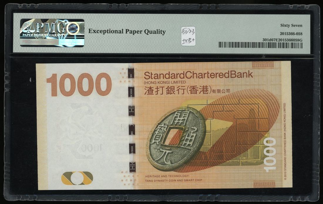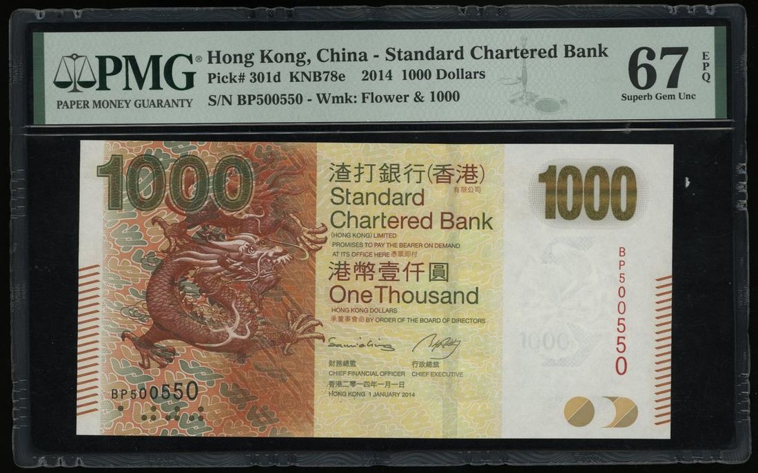 Standard Chartered Bank, Hong Kong, $1000, 1.1.2014, serial number BP 500550, (Pick 301d), PMG 67EPQ Superb Gem Uncirculated