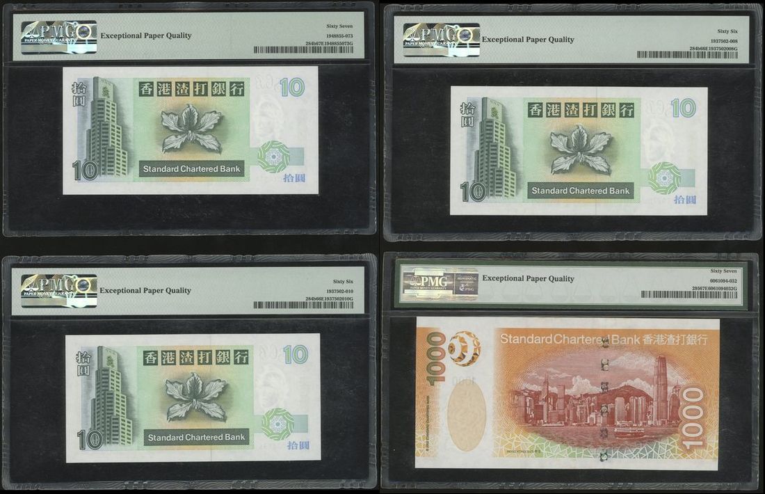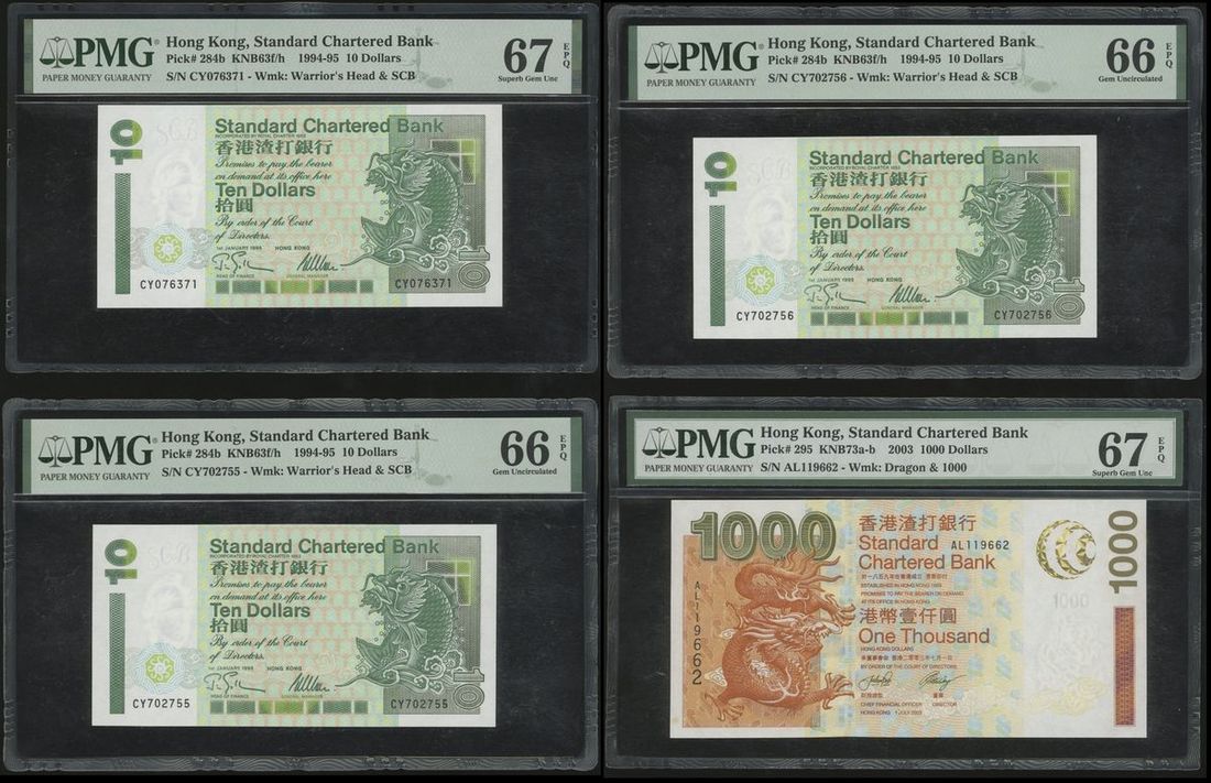 Standard Chartered Bank, Hong Kong, a group of 4 notes, consists of 3x $10, 1.1.1995, and $1000, 1.7.2003, serial numbers CY076371, CY702755-756, and AL119662, (Pick 284b and 295), graded PMG 67EPQ, 66EPQ, 66EPQ and 67EPQ respectively (4).
