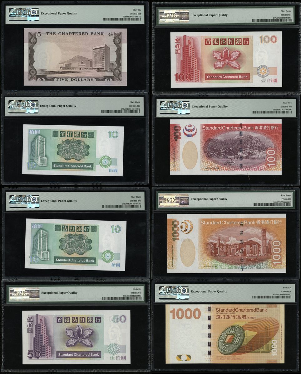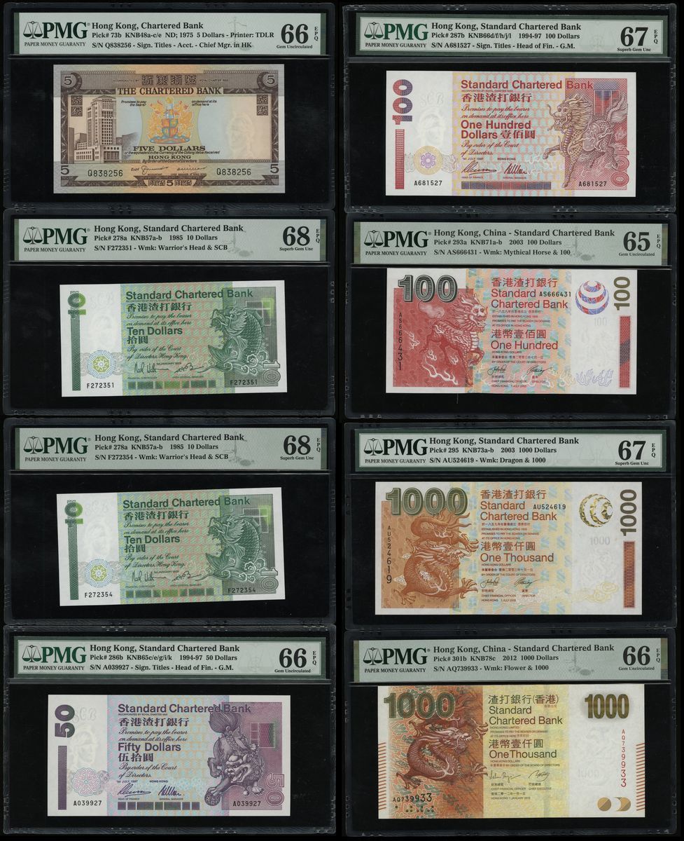 Standard Chartered Bank, Hong Kong, a group of 8x, including: $5, ND (1975); 2x $10, 1.1.1985; $50, 1.7.1997; $100, 1.7.1997; $100, 1.7.2003; $1000, 1.7.2003; $1000, 1.1.2012;