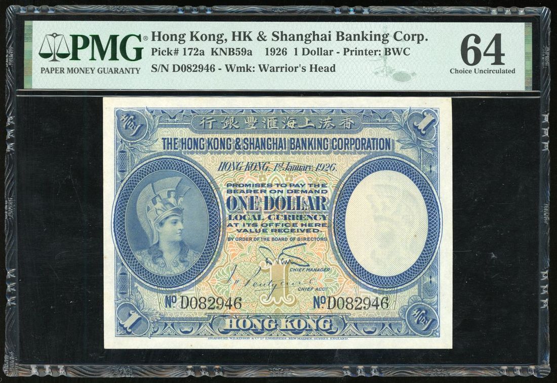 HongKong & Shanghai Banking Corporation, $1, 1.1.1926, serial number D082946, (Pick 172a), PMG 64. First date key type for the series. A high grade example only marred by minor foxed spots. PMG with only 13 better