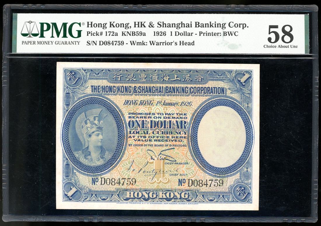 HongKong & Shanghai Banking Corporation, $1, 1.1.1926, serial number D084759, (Pick 172a), PMG 58