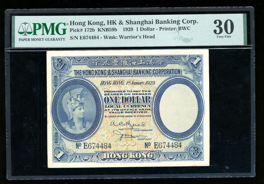 Hongkong & Shanghai Banking Corporation, $1, 1.1.1929, serial number E 674484, (Pick 172b), PMG 30 Very Fine
