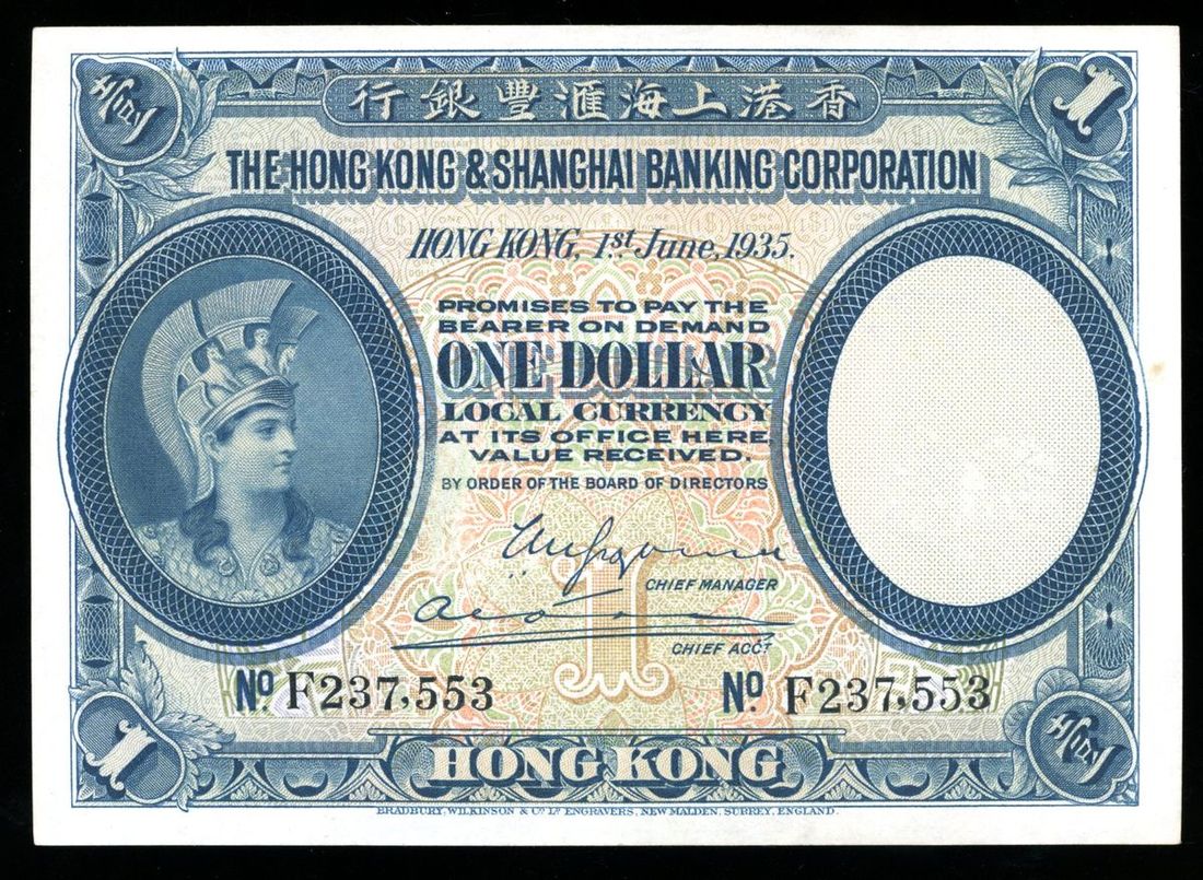 HongKong & Shanghai Banking Corporation, $1, 1.6.1935, serial number F237553, (Pick 172c), one centre crease, extremely fine