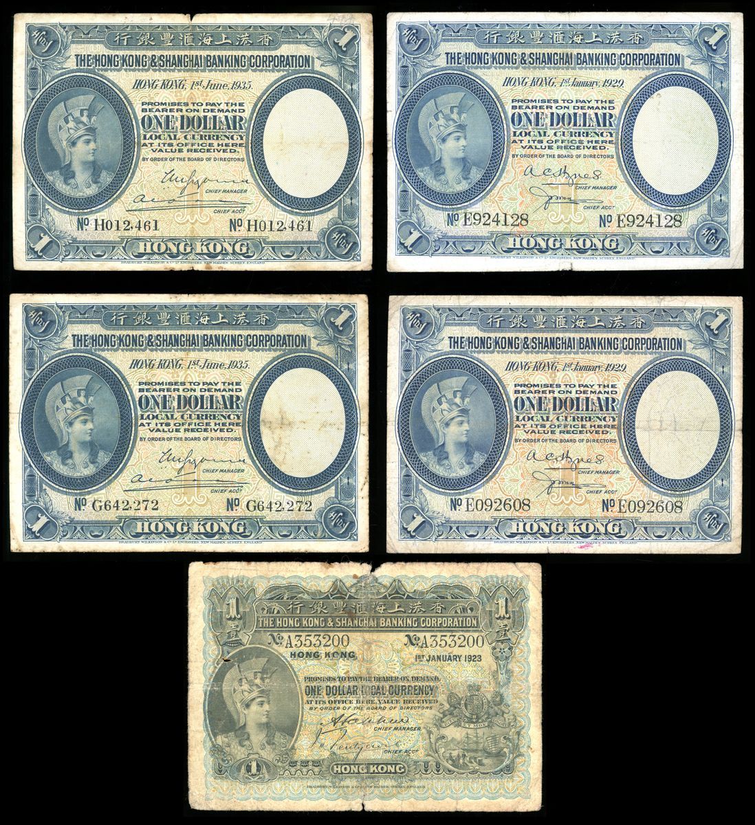 HongKong & Shanghai Banking Corporation, $1 (5), 1923, 1929, 1935, (Pick 171, 172b, c), 1923 $ very good, others generally fine (5)