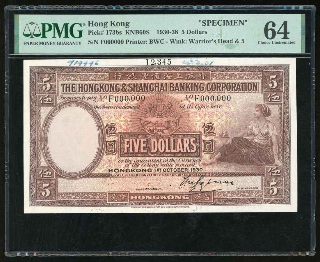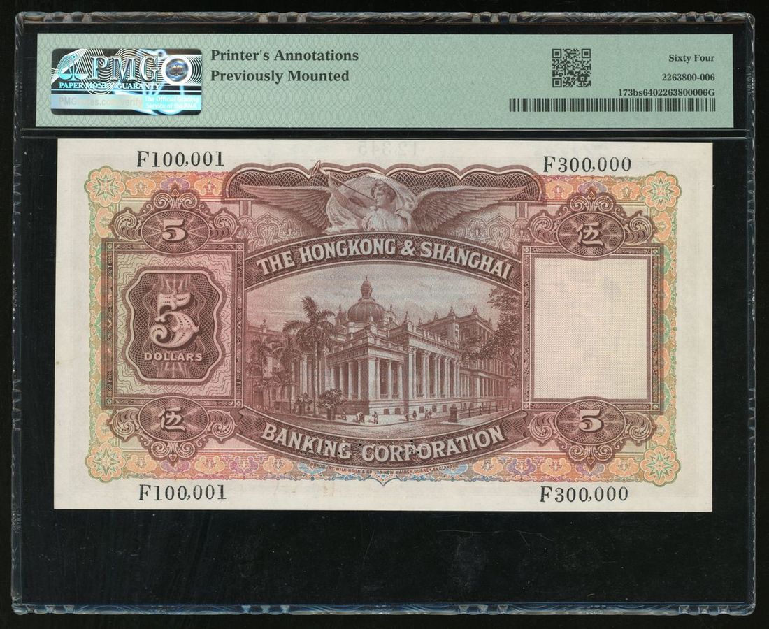 1930年匯豐銀行5元樣票,編號範圍F100,001 - 300,000,控號12,345, PMG 64,有印刷商書寫,黏貼痕跡。樣票罕有打印編號,市場罕見