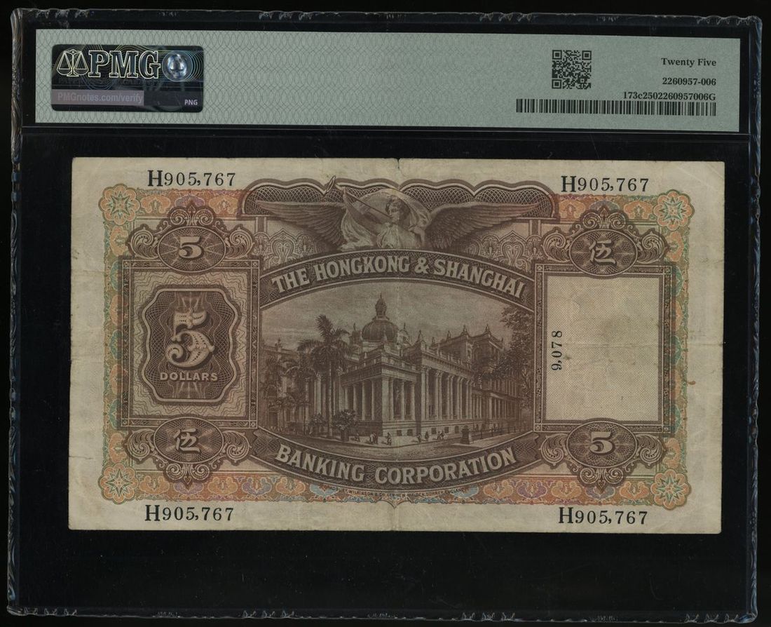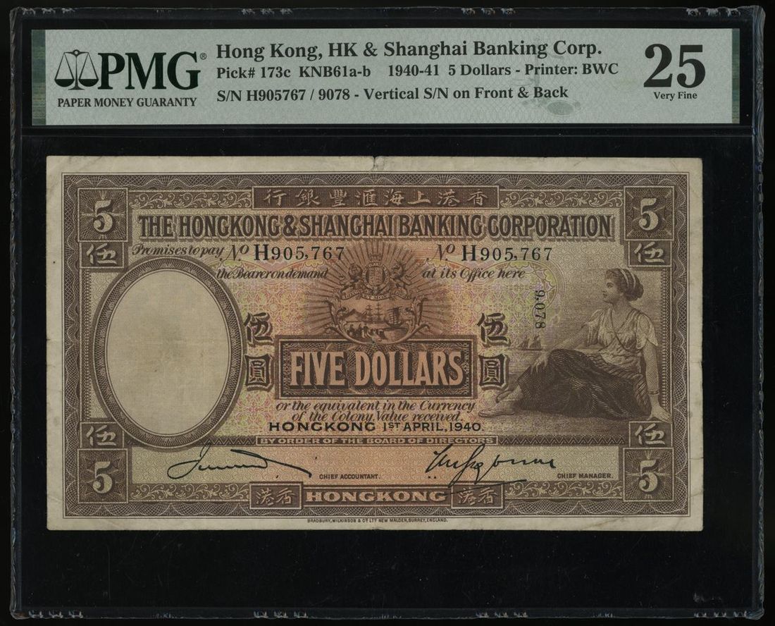 1940年香港上海匯豐銀行伍圓迫簽票,編號 H905767, 9078,PMG 25。1940年迫簽票遠較1941年少。有明顯流通原票