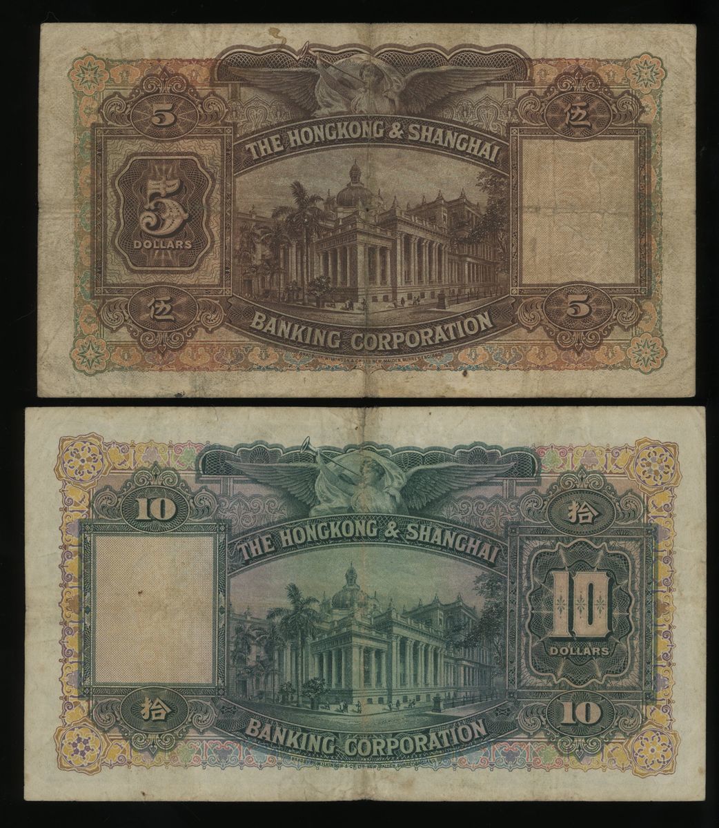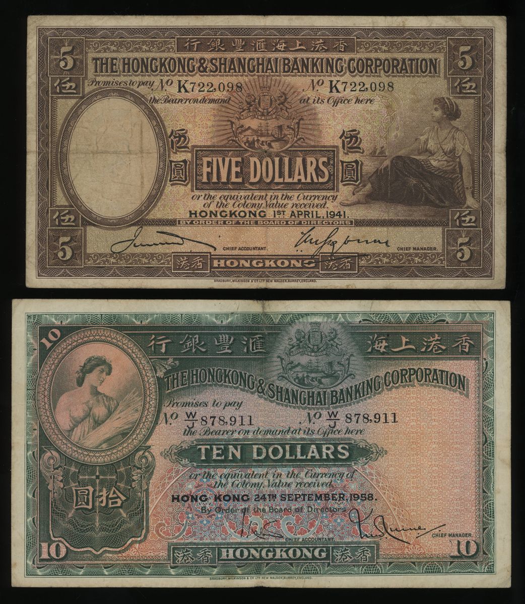 Hong Kong & Shanghai Banking Corporation, a pair of $5 and $10, 1941 and 1958, serial number K722098 and W/J878911 respectively, (Pick 173d, 179Ad), both presentable about very fine.(2)