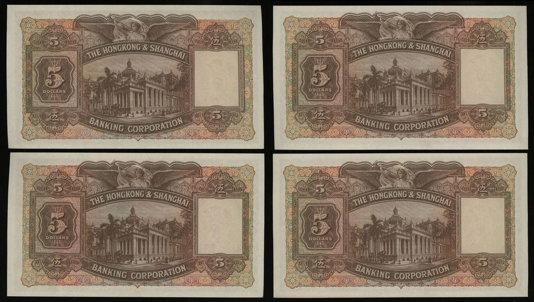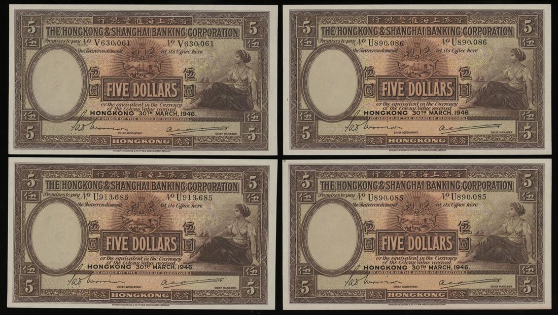 HongKong & Shanghai Banking Corporation, $5 (4), 30.3.1946, prefixes U, V, (Pick 173e), original good extremely fine to about uncirculated (4)