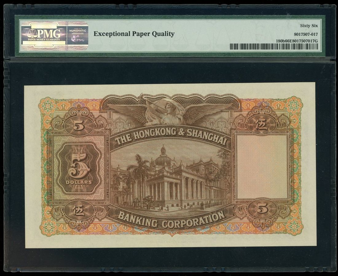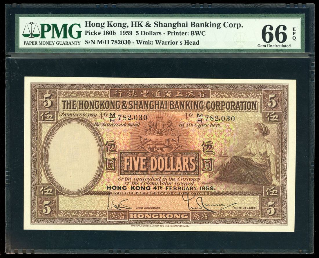 HongKong & Shanghai Banking Corporation, $5, 4.2.1959, serial number M/H 728,030, (Pick 180b), PMG 66EPQ