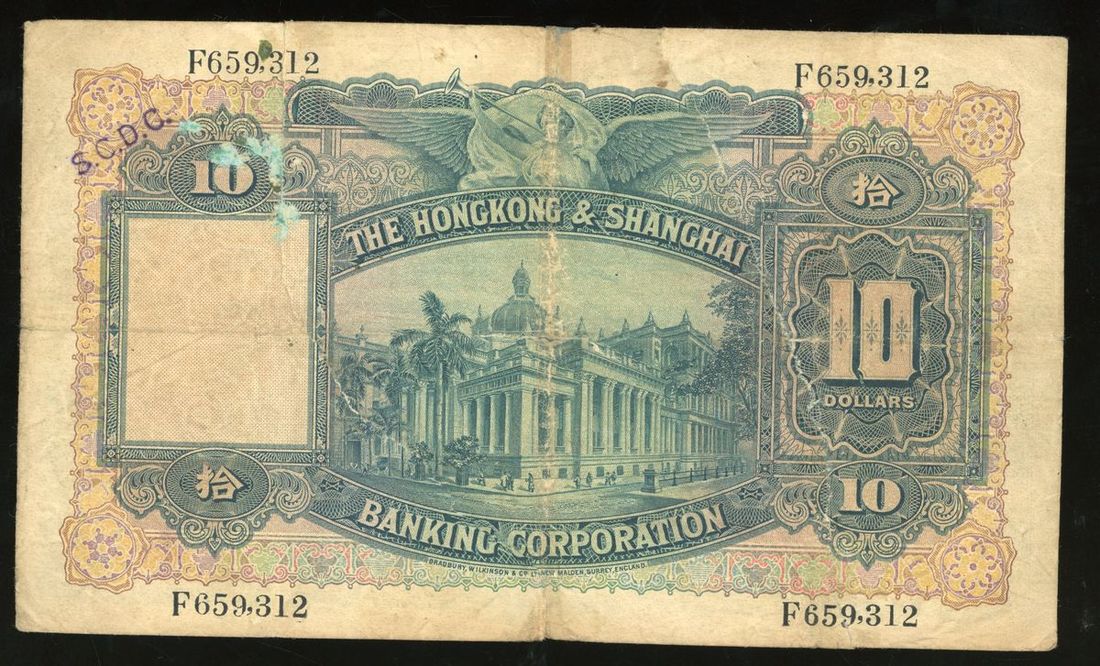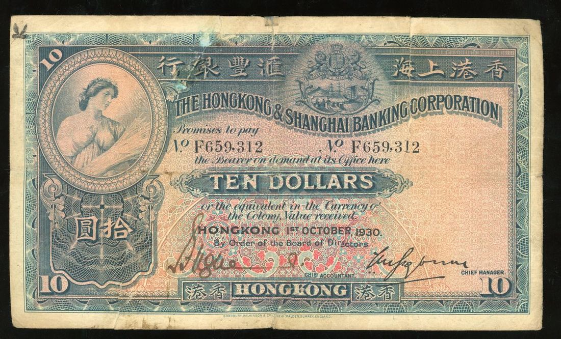 Hongkong & Shanghai Banking Corporation, $10, 1.10.1930, serial number F 659312, handsigned signature at lower left,