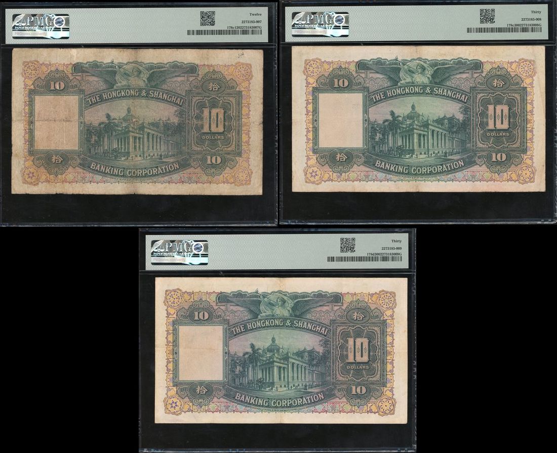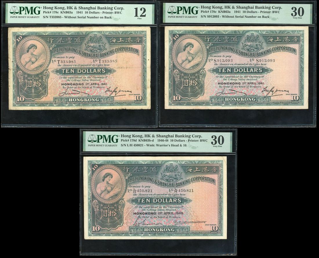 Hong Kong & Shanghai Banking Corporation, a trio of $10, 1.4.1941 and 1.4.1948, serial number T333985, S912093 and L/H450821 respectively, (Pick 178c, 178d), PMG 12, 30 and 30 .(3)