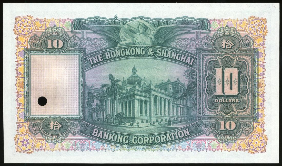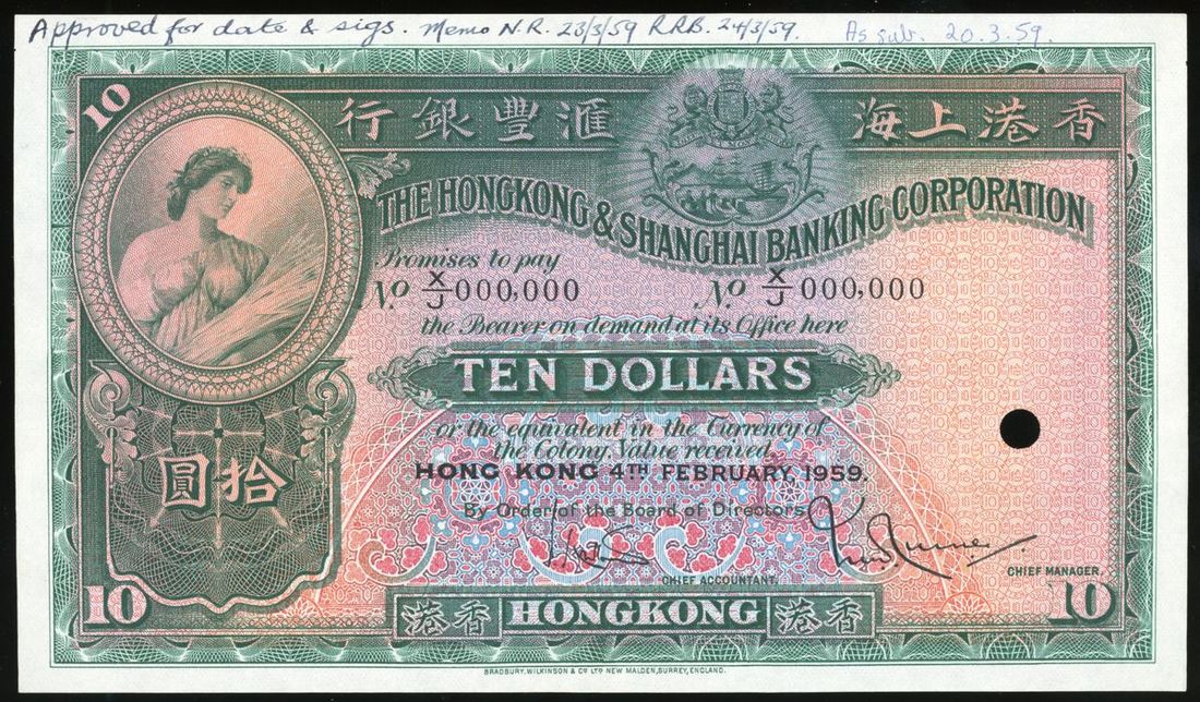 HongKong & Shanghai Banking Corporation, specimen $10, 4 February 1959, serial number X/J 000,000, (Pick 179Aes), last date and second to last prefix, printer's annotations at top margin, good extremely fine.