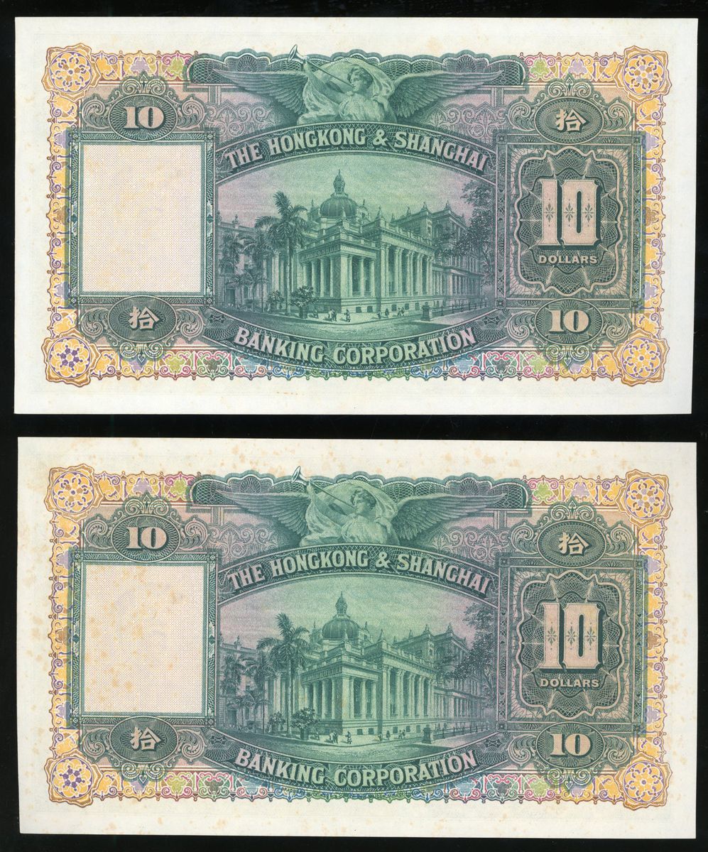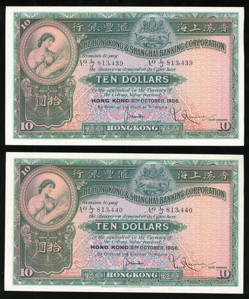 Hongkong & Shanghai Banking Corporation, a consecutive pair of $10, 5.10.1956, serial numbers L/J 813439-40, (Pick 179Ab), About Uncirculated, foxing (2)