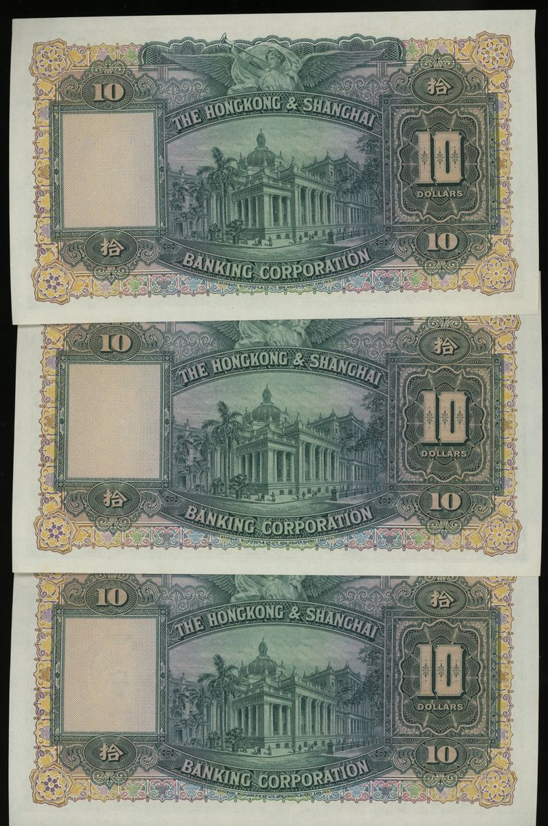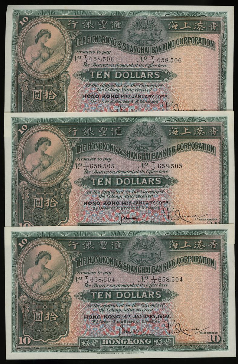 HongKong & Shanghai Banking Corporation, consecutive $10 (3), 14.1.1958, serial number T/J 658,504/5/6, (Pick 179A), minor foxing/stains at margins, uncirculated (3)