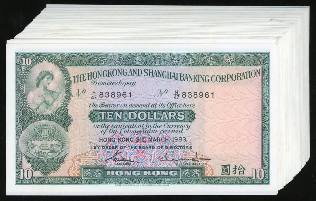 HongKong & Shanghai Banking Corporation, consecutive $10 (40), 31.3.1983, serial numbers H/47 838961-839000, (Pick 182j), some handling and at corners at well, about uncirculated (40)