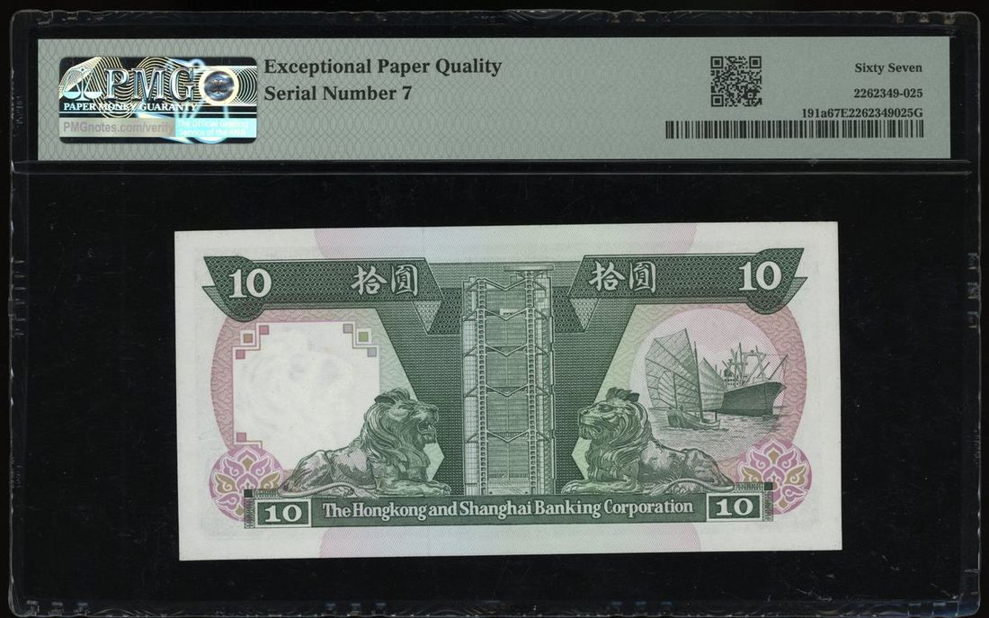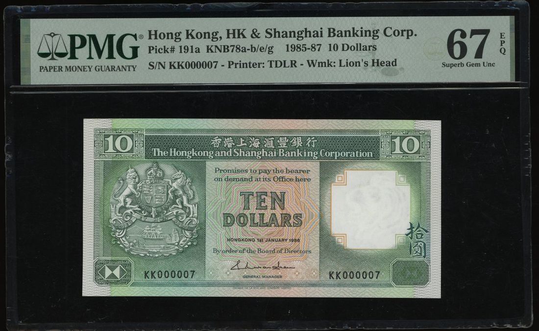 HongKong & Shanghai Banking Corporation, $10, 1.1.1986, serial number KK000007, (Pick 191a), PMG 67EPQ. Low number!