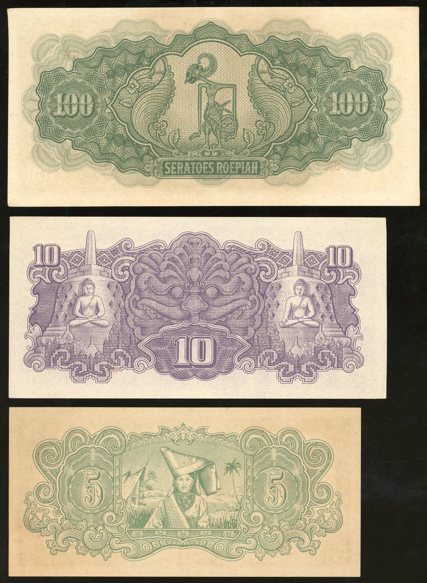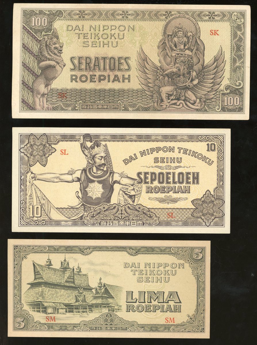 Dai Nippon Teikoku Seihu, Netherlands Indies Japanese Occupation, 5 roepiah, 10 roepiah and 100 roepiah, ND (1944), (Pick 130, 131, 132), 100 roepiah About Uncirculated, the rest Uncirculated (3)