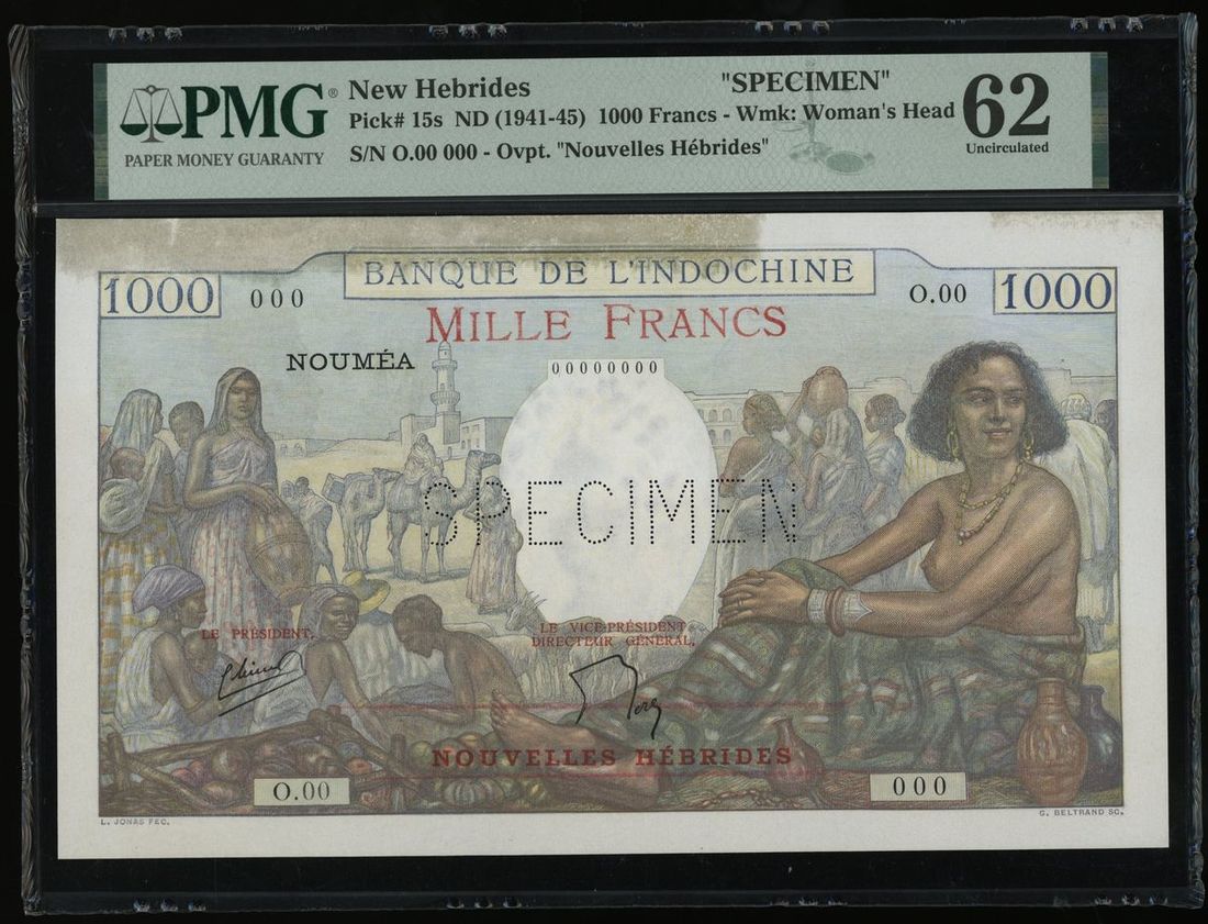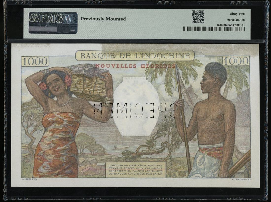 1941-45年新赫布里底群島1000法郎樣票,編號O.00 000,PMG 62,有黏貼痕跡,評級紀錄中之亞軍分,僅有5枚獲評更高分