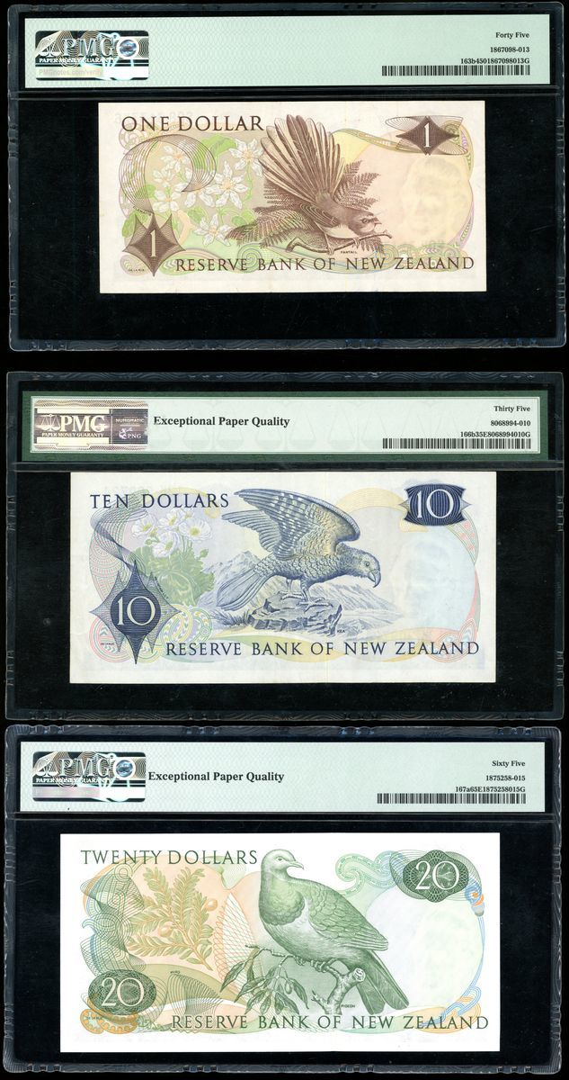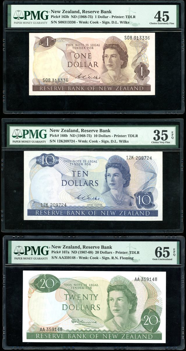 Reserve Bank of New Zealand, a group of 3x, including $1, $10 and $20, ND (1967-75), (Pick 163b, 166b, 167a), PMG 45, 35EPQ, 65EPQ (3)
