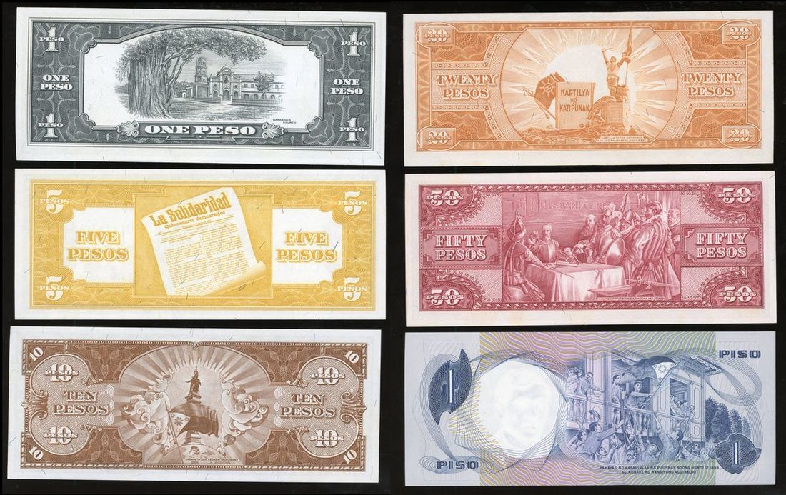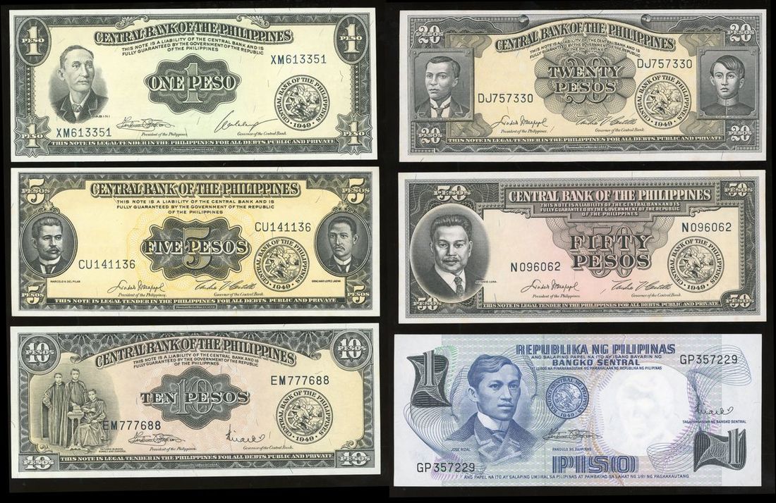 Central Bank of The Philippines, a group of 6x, including: 1 peso, 5 pesos, 10 pesos, 20 pesos, 50 pesos, ND (1949-1969), and Bangko Sentral ng Pilipinas 1969 1 piso,