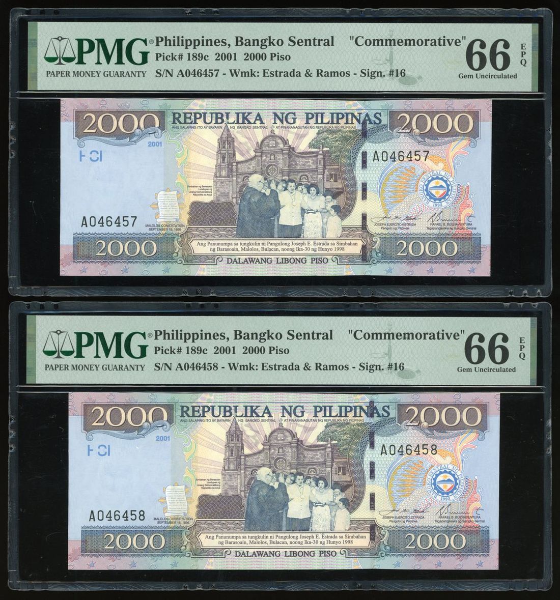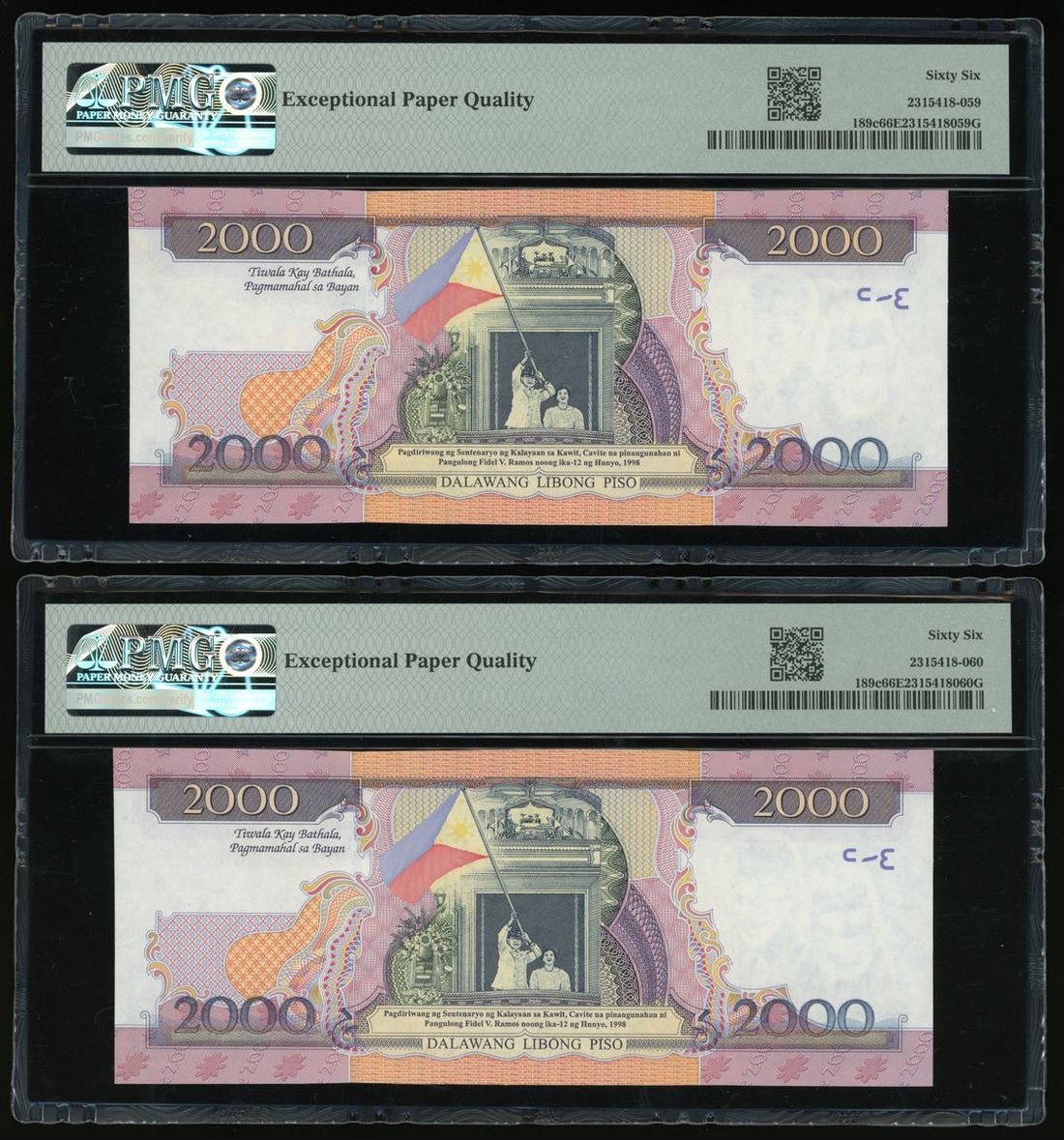 Bangko Sentral ng Pilipinas, The Philippines, a consecutive pair of 2000 piso, 2001, serial numbers A 046457-58, Centennial of First Republic commemorative issue,