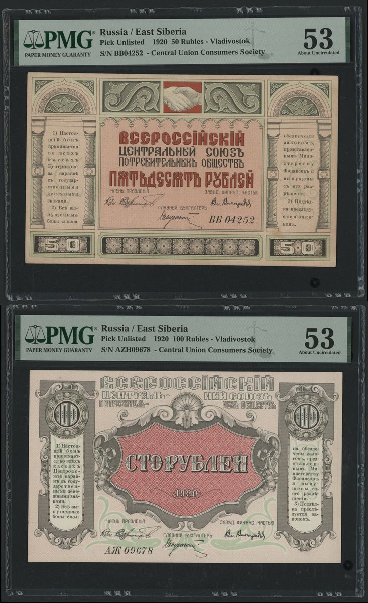 1920年遠東共和國紙鈔一組2枚,50盧布及100盧布,編號 BB 04252及AZH 09678,均評級為PMG 53