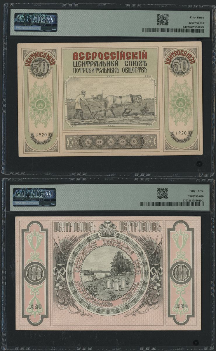 Central Union Consumers Society, Russia / East Siberia, 50 rubles and 100 rubles, 1920, serial numbers BB 04252 and AZH 09678, The Central Union Consumers Society were comprised of local societies and unions which were nationalised by the Communist Party, and were active in the creation of rural social infrastructure as well as the production of food and non-food products.