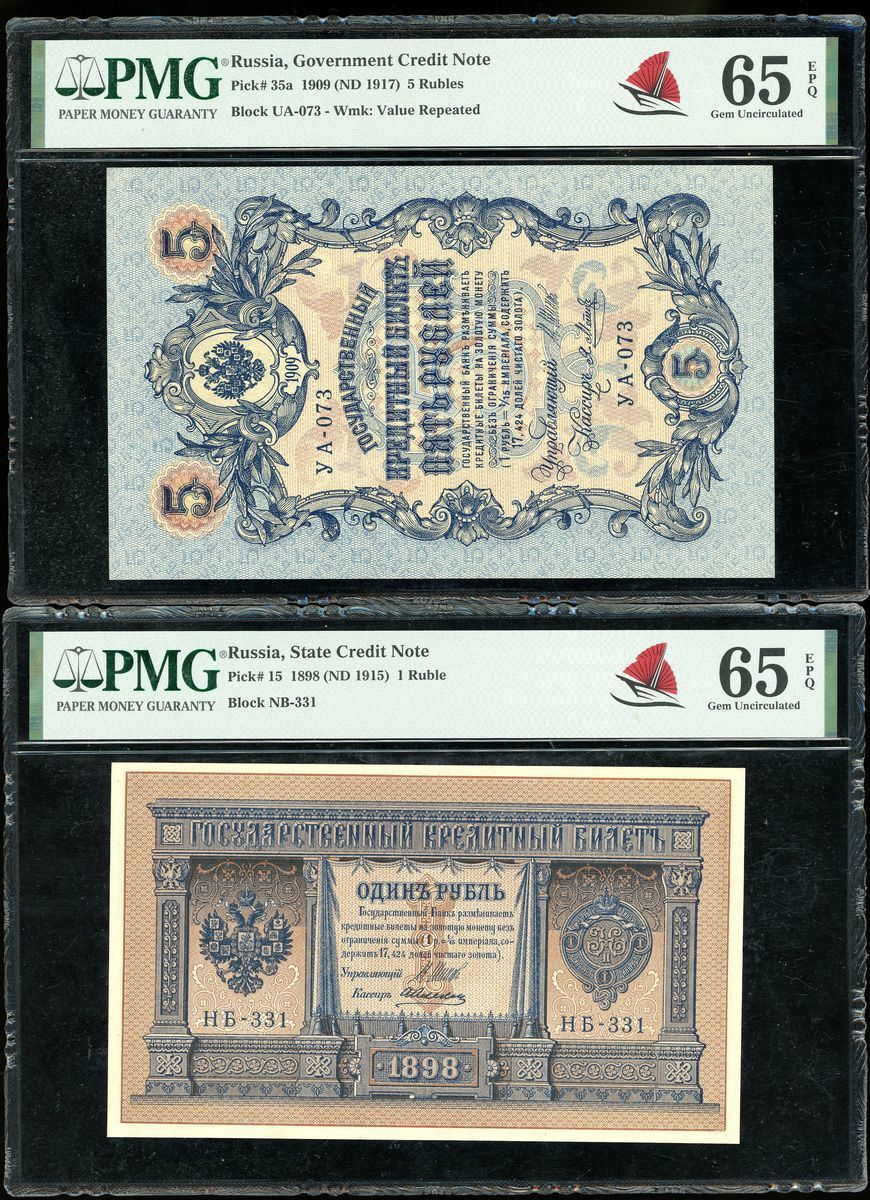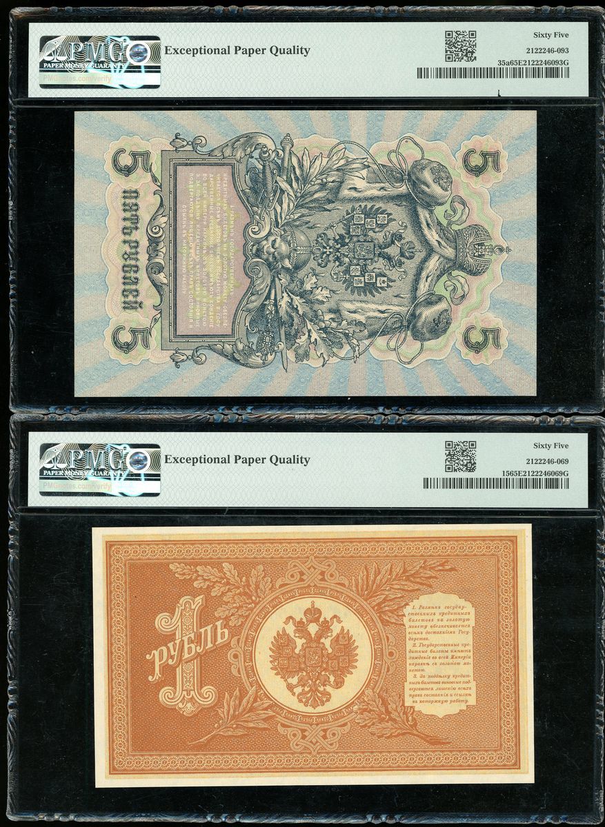 Gosudarstvenniy Bank, Russia, 1 ruble 1915 and 5 rubles 1917, (Pick 15, 35a), both graded PMG 65EPQ Gem Uncirculated (2)